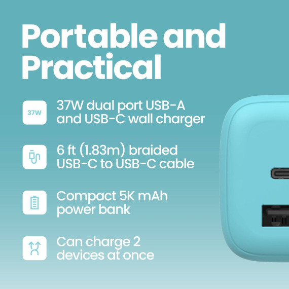 GEMS USB-C to USB-C Charging Gift Set with 5000MmAh Power Bank, Cable, and Wall Charger - Teal Blue
