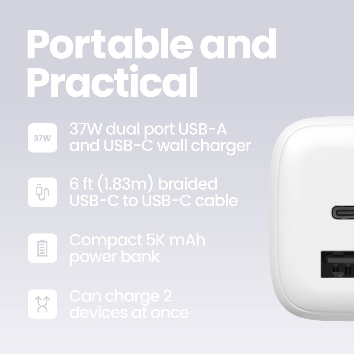 The GEMS USB-C to USB-C Charging Giftset keeps your favorite devices powered up no matter where your day takes you. This handy set includes a compact 5,000 mAh power bank that can charge two devices at once, a dual port wall charger for fast charging at home, and a durable 6ft braided cable that gives you extra reach and flexibility. The built-in battery indicator makes it easy to see when your power bank is ready to go. Whether you’re traveling or just need a reliable way to stay connected, the GEMS USB-C to USB-C Charging Giftset has everything you need in one simple bundle.