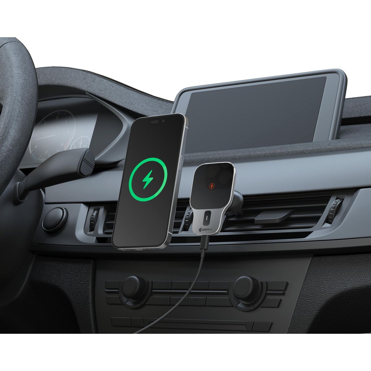 The Griffin 15W Wireless Charging Vent Mount offers fast wireless charging with strong magnetic grip and flexible viewing positions. Its sleek, compact design fits easily in vehicle vents and securely holds your phone whether charging or not, making it an ideal accessory for safe, convenient driving.
