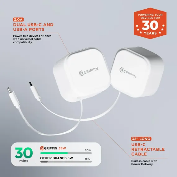 Griffin 35W Dual Port USB Wall Charger with Retractable 20W USB-C Cable, Compact Plug with Foldable Design