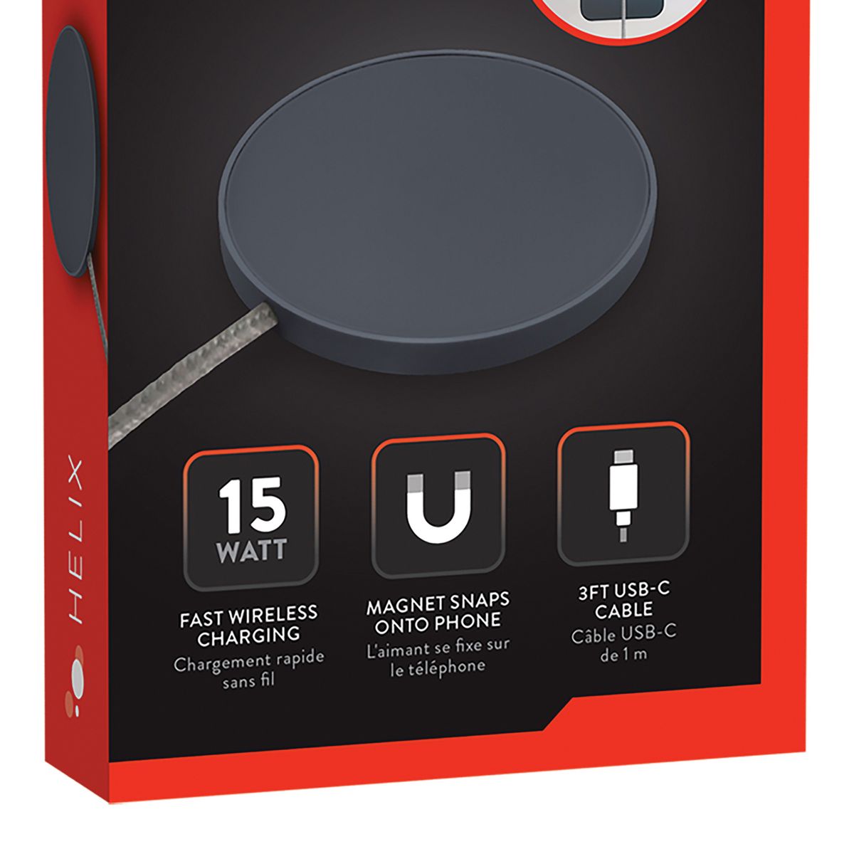 Designed for MagSafe® devices, the HELIX 15-Watt MagWireless Charger is ideal for fast charging at home or on the go. The magnet snaps onto your phone and enables you to use your phone while charging. 15-watt fast wireless charging with ultra-durable braided cable, the charger is compatible with MagSafe® devices.
