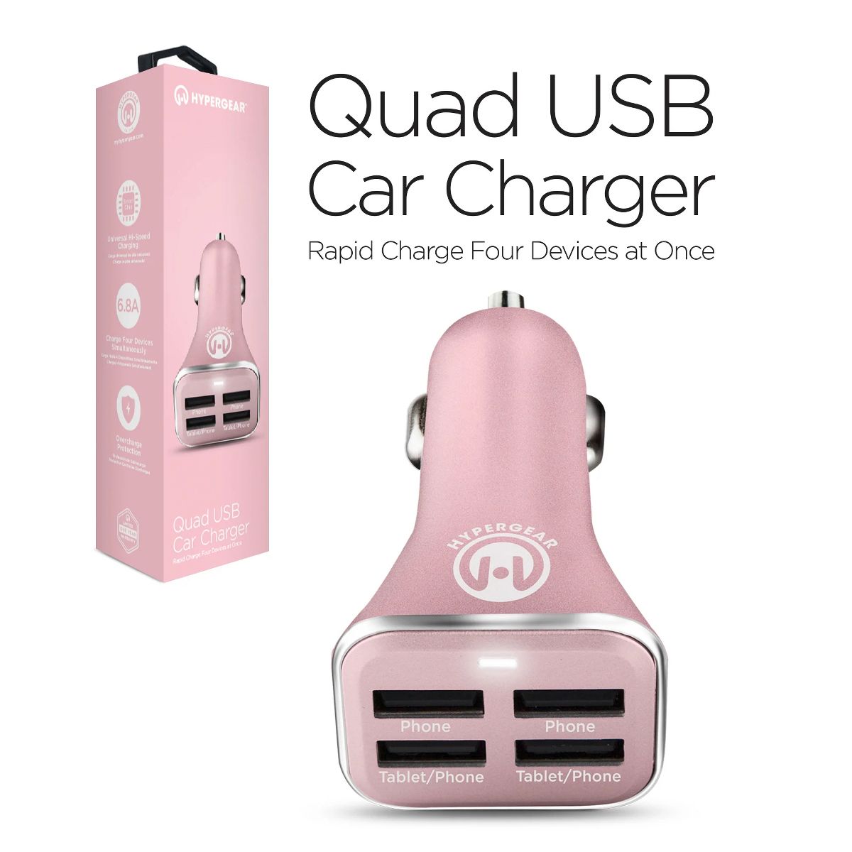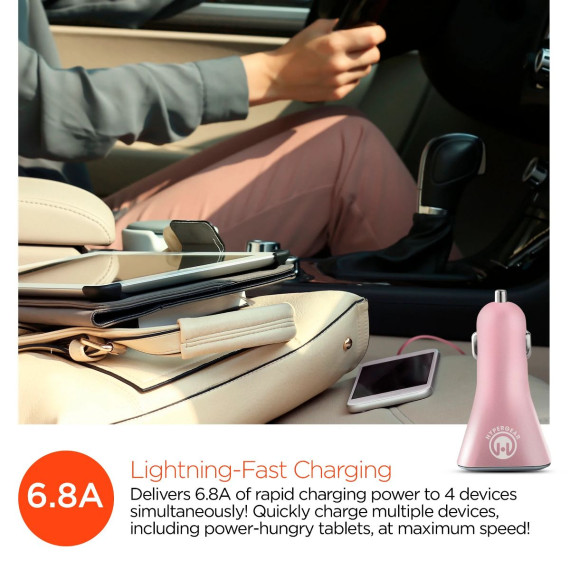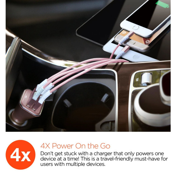 The High-Power Quad USB Car Charger delivers colossal performance from a pocket-sized device. Perfect for power-heavy mobile lifestyles, it features 4 USB ports with an incredible 6.8A combined output. It can rapid charge as many as four devices simultaneously! Say goodbye to bulky chargers that barely fit into your console, the compact and lightweight Quad is designed with a low-profile. Available in rose gold, gold, and silver finishes, as well as classic black and white, this eye-catching accessory is a sleek way to power up on the go. No matter where the road takes you, Always Arrive Fully Charged!