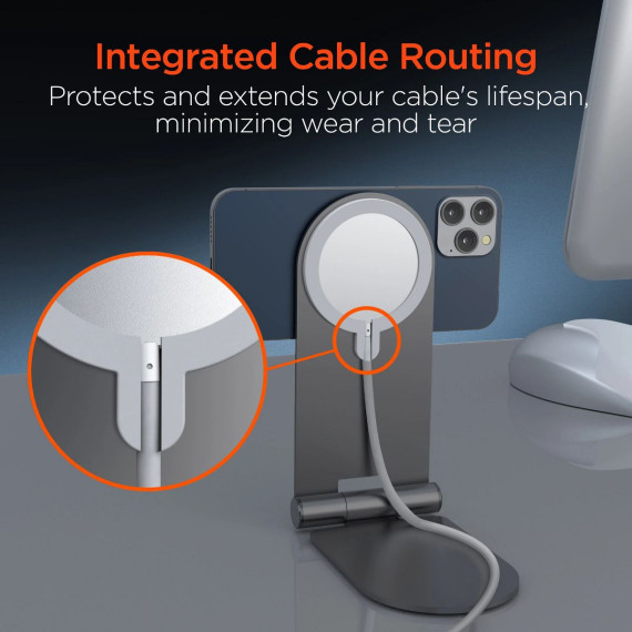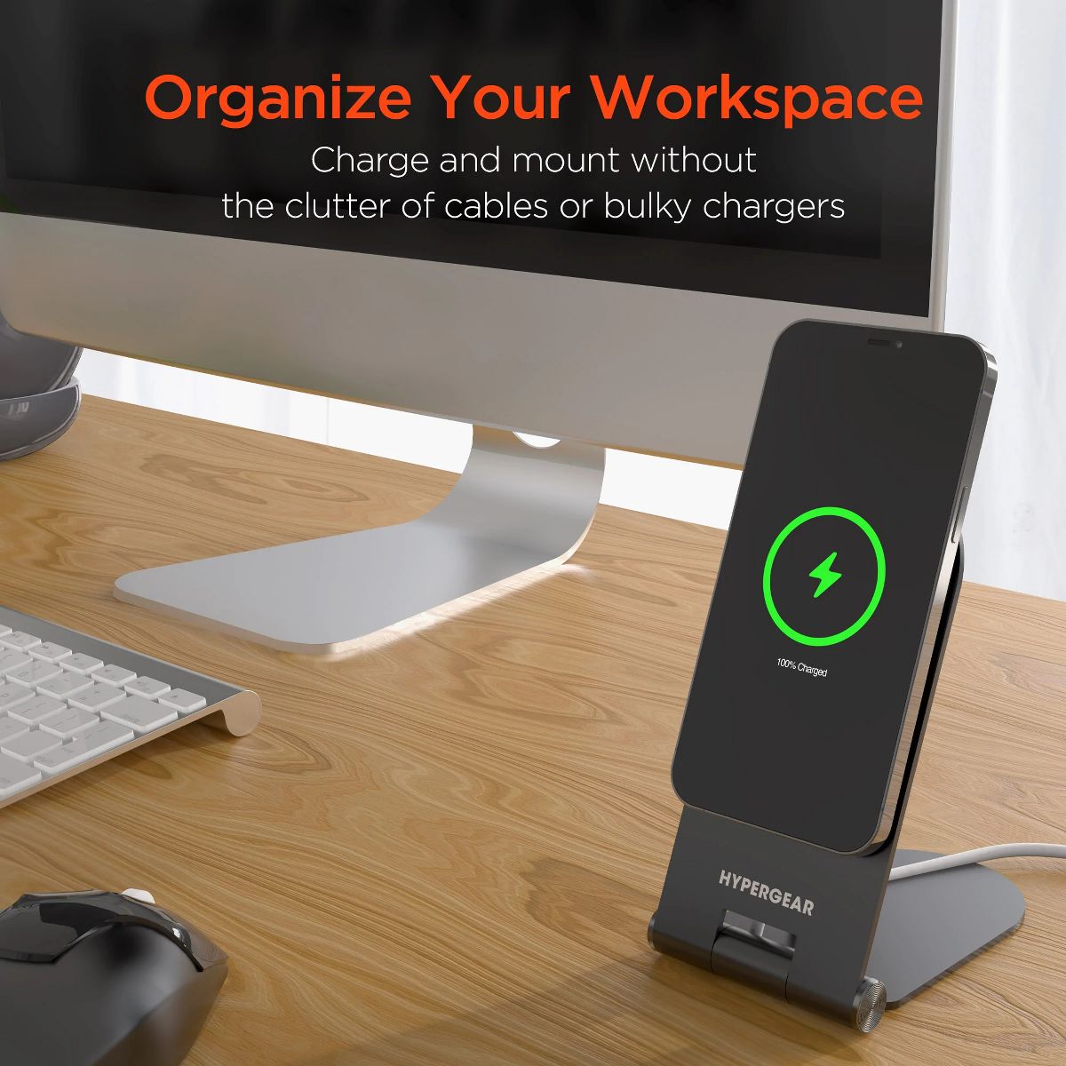 Organize your workspace with the convenient, space-saving MagView! The MagView keeps your phone mounted in view and charging with full compatibility from Apple's MagSafe® Charger or HyperGear's Magnetic Wireless Fast Charger. Enjoy a hassle-free, quick installation by placing your charger in the included non-slip protective silicone ring and snapping on your MagSafe® compatible iPhone or case for a powerful magnetic hold in either portrait or landscape. With 270° of adjustable viewing angles, it has never been easier to find the perfect view and get powered up as you work, watch videos, or play games. The modern and functional design, crafted from aircraft-grade aluminum construction, keeps the stand cool to the touch while charging. The MagView looks great on any desk or nightstand and eliminates the need for one more charging cord! Maintain a clean workspace without the clutter of cables and bulky chargers!