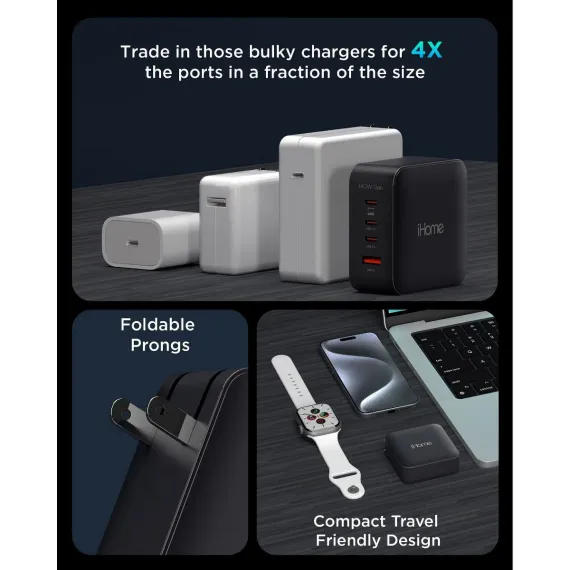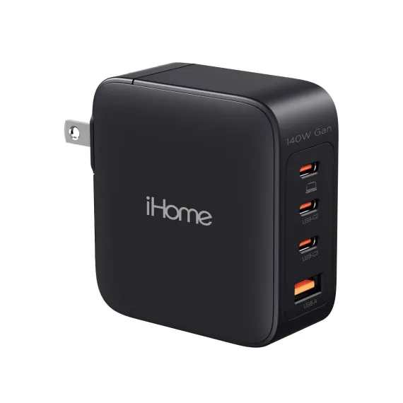 iHome 140W GaN Charger, 3 USB-C Power Delivery Ports & 1 USB-A, 4-Port Compact Wall Charger for Laptop, Black