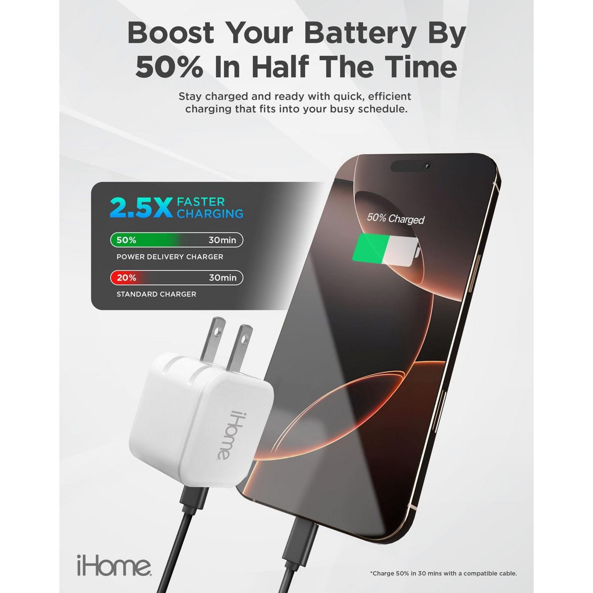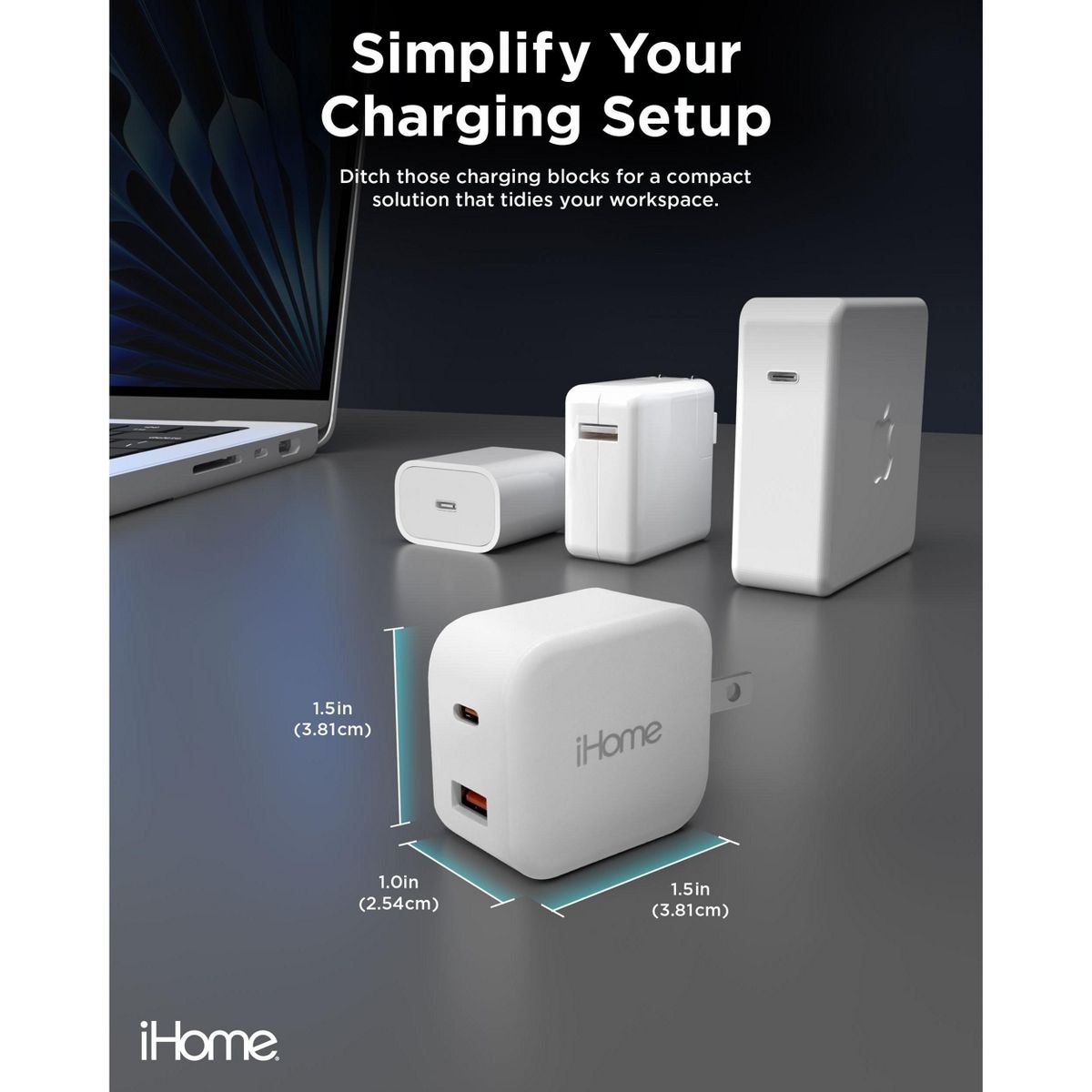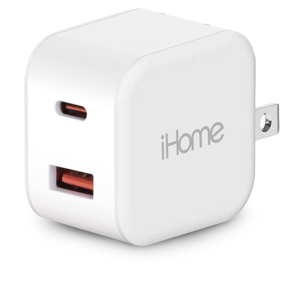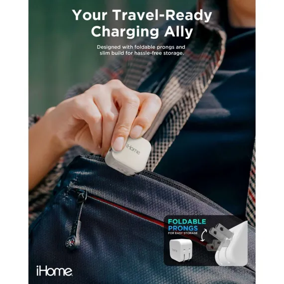iHome 20W Dual Port Wall Charger, USB-C & USB-A, Fast Charging, Foldable Plug, Universal, Compact for Travel