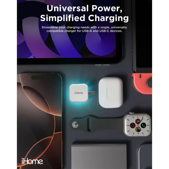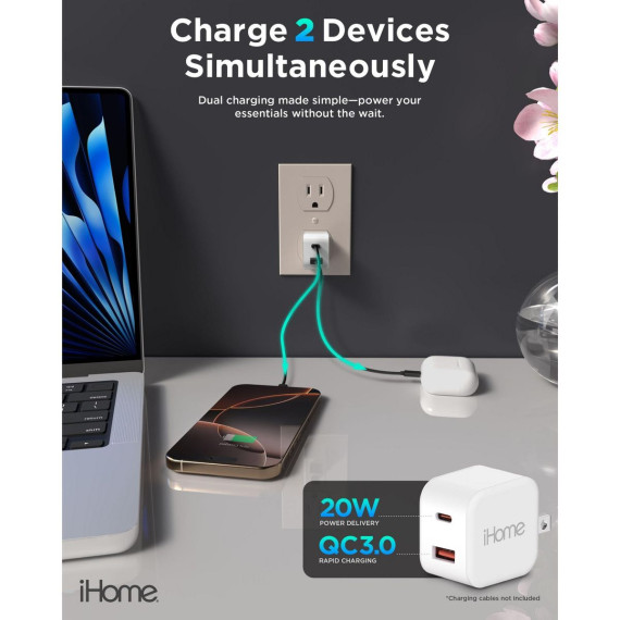 Say hello to seamless charging with the iHome 20W Dual Port Wall Charger. Designed with convenience in mind, this compact and powerful charger block fits seamlessly into your busy lifestyle. Whether you’re at home, in the office, or on the go, our wall charger block is ready to keep your devices powered up and ready for action. Featuring dual ports with QC (USB-A) and PD (USB-C) technology, our USB block charger delivers a total of 20 watts for rapid and efficient charging. It’s perfect for charging two devices simultaneously, so you can power up your smartphone, tablet, or any other USB-A or USB-C compatible gadget without missing a beat. No more waiting for one device to finish—stay connected and productive with this versatile dual charger block. The iHome wall charger is designed not only for fast charging but also with smart features that make your charging setup more convenient and organized. Folding prongs protect the block charger when not in use, keeping it compact and easy to store. Slip it into your bag or tuck it away in a drawer without worrying about damaging your charger. Its sleek, minimalist design adds a touch of style to your tech accessories, blending effortlessly with your environment. From fast charging to durable functionality, this block charger is your go-to solution for staying powered up. With universal compatibility across USB-A and USB-C devices, the iHome wall charger block simplifies your charging routine and cuts down on the clutter of multiple chargers. Say goodbye to slow charging and hello to efficient power—anytime, anywhere.