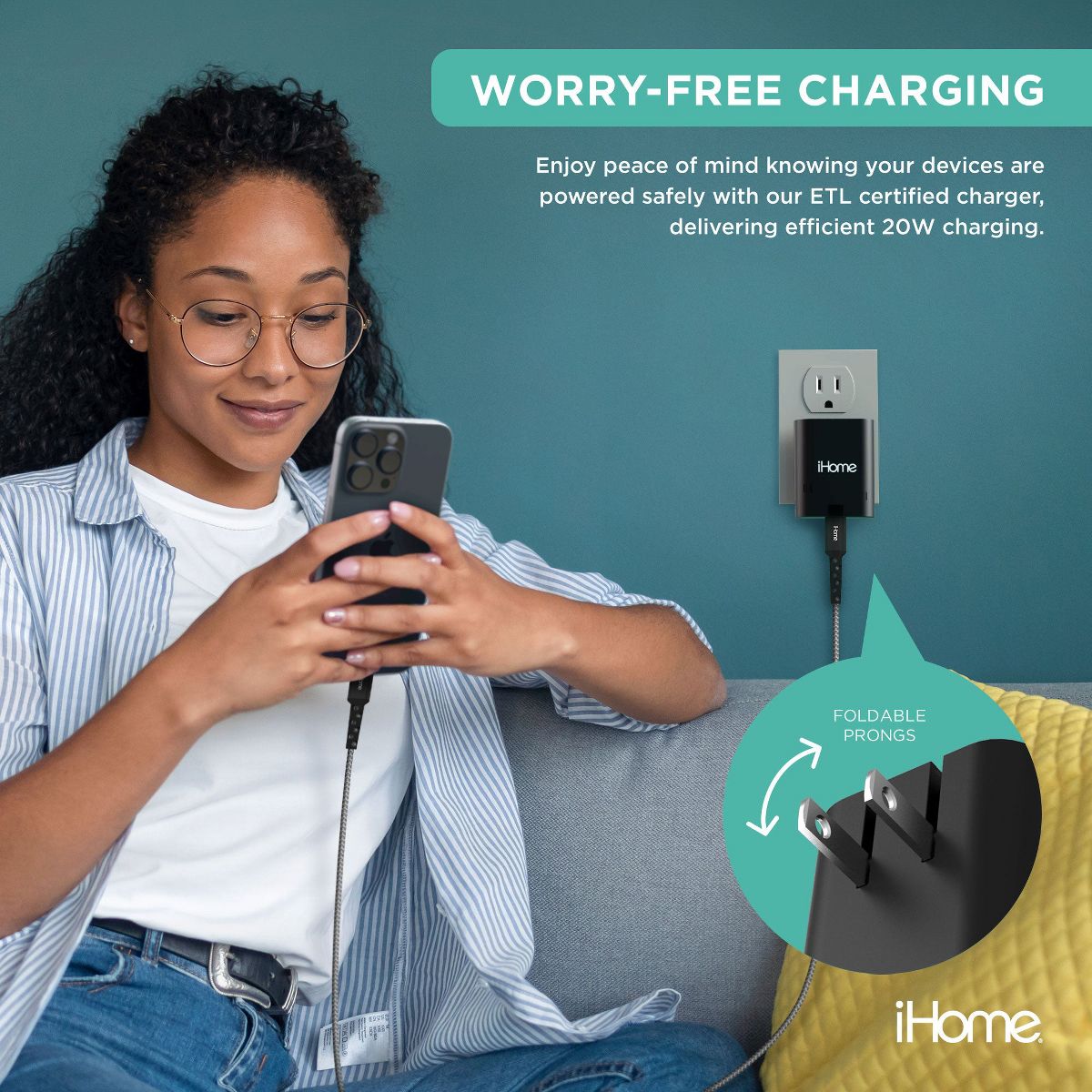 iHome 20W USB-C Wall Charger with 6ft USB-C to USB-C Cable, Fast Charging, Lightweight & Portable