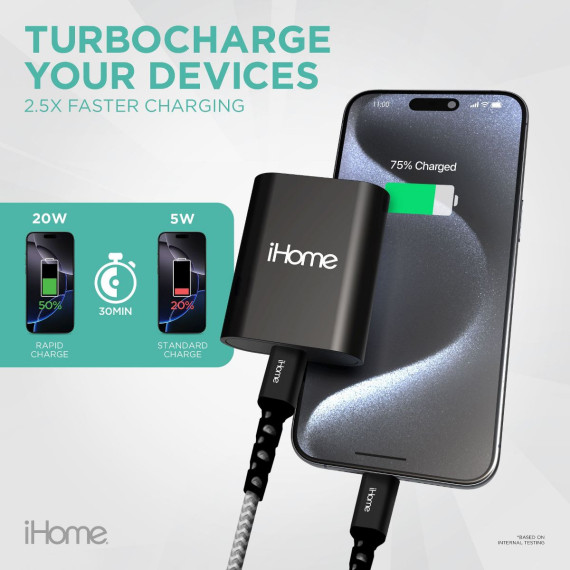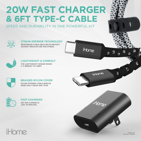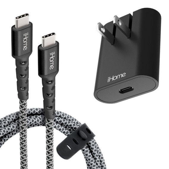 Meet the iHome 20W Wall Charger and 6FT USB-C to USB-C Cable set—your ultimate solution for all your charging requirements. Designed with performance and durability in mind, this set ensures rapid charging for your devices while providing long-lasting reliability. The iHome charger block features a powerful 20W output, delivering efficient power to your devices. It's the perfect choice for anyone looking for a fast charging solution for a variety of USB C compatible devices. With the iHome charger, you can expect optimal performance every time. Included with the charger is a 6FT USB-C to USB-C cable, expertly crafted from premium braided nylon. This cable is built to last, featuring a reinforced neck that reduces strain at connection points, making it a long USB C cable ideal for various settings. Use it at home, in the office, or on the go—its flexibility and convenience ensure your devices are always ready. Plus, the cable supports fast charging and data synchronization, so you can stay productive and connected. To help you manage your cables, the set also includes a silicone cable tie, which keeps your cords neatly organized and tangle-free for easy storage. Safety is a top priority with the iHome charger set. Both the charger and the cable are ETL listed, ensuring they meet rigorous safety standards. Whether you're charging an Apple iPhone, a Samsung, or a Google Pixel, this versatile set has you covered. Upgrade your charging experience with the iHome 20W Wall Charger and USB-C to USB-C Cable set. Its compatibility with a wide range of devices makes it the perfect solution for all your charging needs. Don’t miss out—invest in this high-quality, durable, and efficient charging solution today!
