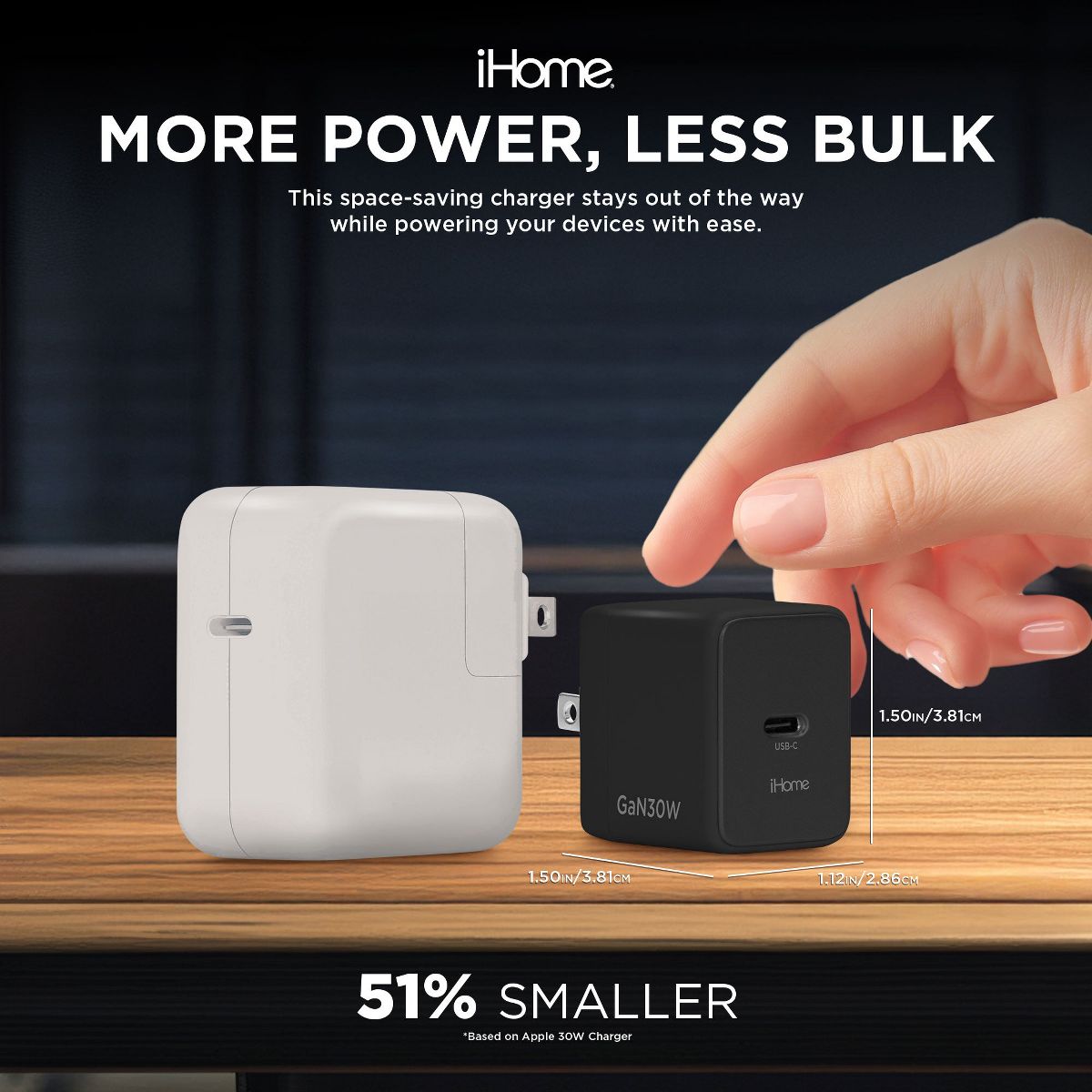 iHome 30W GaN Universal Charger, USB-C Block, Compact with Power Delivery & Folding Prongs, Travel-Friendly (Black)