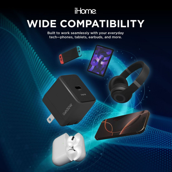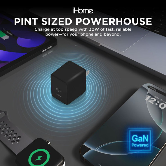 Meet the iHome 30W GaN Universal Charger—a sleek, modern charging solution designed to power your devices faster, safer, and more efficiently than ever before. Compact and travel-ready, it’s built with cutting-edge Gallium Nitride (GaN) technology to deliver high-performance charging in a remarkably small package. Whether you’re powering up your smartphone, tablet, or other USB-C enabled devices, the 30W Power Delivery ensures quick and reliable charging on the go. Its folding prongs and lightweight build make it perfect for travel, work, or everyday use, while its modern design fits seamlessly into your tech setup. Safety is built-in with a multi-protection system guarding against overcharging, voltage spikes, short-circuits, and overheating. You’ll get peace of mind with every charge, whether at home or abroad. From commuters to frequent travelers to everyday users, the iHome GaN charger is the perfect upgrade for fast, safe, and efficient charging.