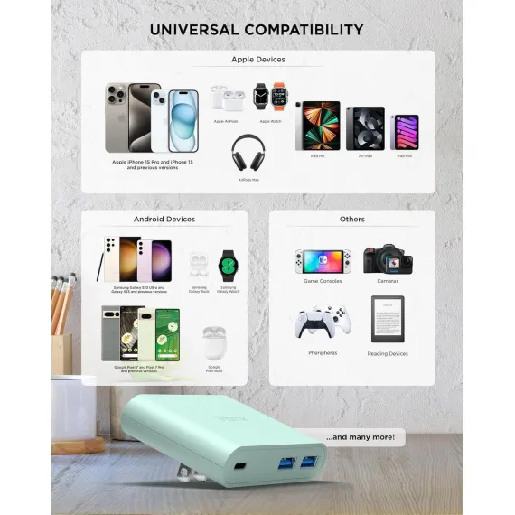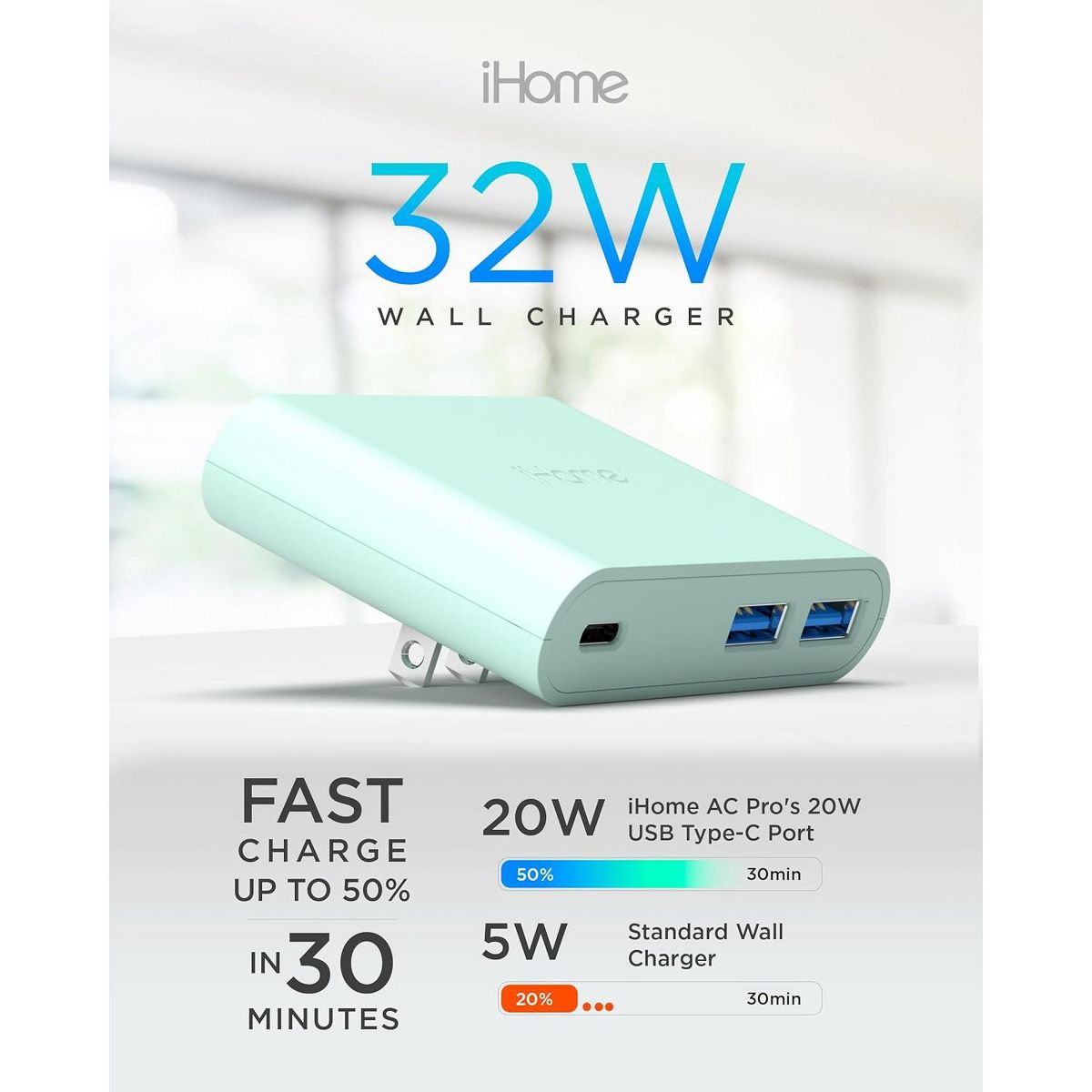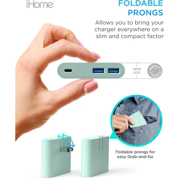 Experience the power of multiple charging with iHome's 32W AC Pro Multi Port USB Wall Charger - your ultimate charging hub. This compact and sleek usb charging hub is equipped with 3 total USB ports - 1 USB C port and 2 USB A ports. Charge your iPhone, iPad, Apple Watch, or any other mobile device simultaneously, without the need for multiple charger blocks. The USB-C port supports power delivery, offering you the luxury of charging 2x faster, with 50% in just 30 minutes, making it a true usb c fast charger. This usb c wall charger has a unique flat and slim design, allowing it to fit snugly behind tight spaces and furniture, making it the perfect sleek socket for your charging needs. With its universal compatibility, it works with all USB charging cables, transforming into a versatile charging station for Apple devices and beyond. The foldable prongs offer ultimate portability, making it an excellent travel companion. It can easily fit in your bag or suitcase, ensuring you always have a charging station at your fingertips. Gone are the days of carrying around multiple chargers for multiple devices. With the iHome 32W AC Pro Multi Port USB Wall Charger, you have a single, powerful charger for all your gadgets. The type c charger offers fast charging, making it an ideal iPhone fast charger or iPad charger. This usb c charger block ensures your devices are always ready and charged. Whether you're at home or on the go, this usb wall charger is your one-stop charging solution. It isn't just a usb charger, or a usb c charger block, or even a usb wall plug. It's all of these and more, rolled into one. It's a charging station, a fast charger, a wall charger, and a charger block, designed with a modern, sleek look that complements any space. Experience the power and convenience of the iHome 32W AC Pro Multi Port USB Wall Charger, the ultimate usb charging hub for all your devices. With iHome, you get more than just a charger, you get a charging solution that fits your lifestyle.