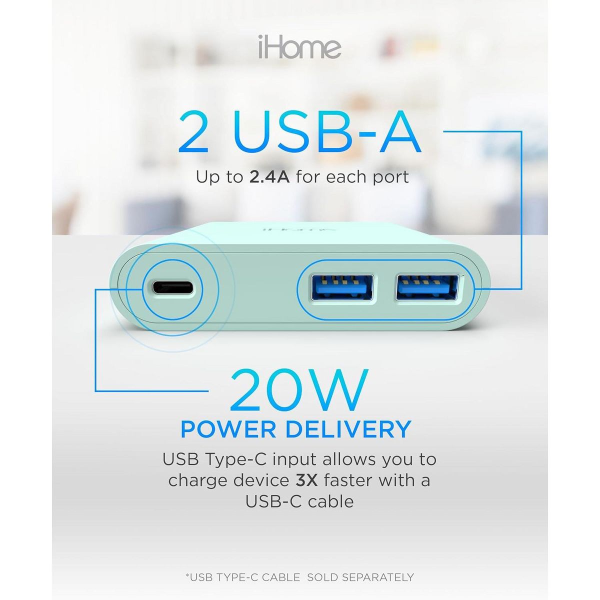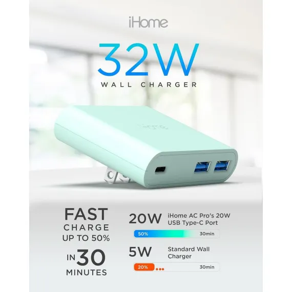 iHome 32W AC Pro Multi Port USB Wall Charger - Charging Station with 3 Ports (1 USB-C, 2 USB-A) Fast Charging, Universal Compatibility