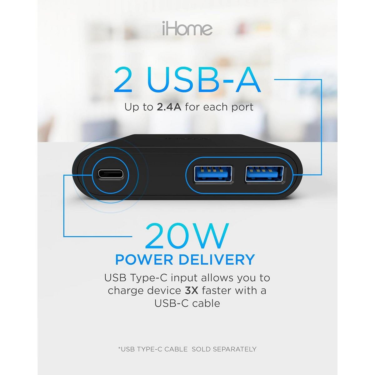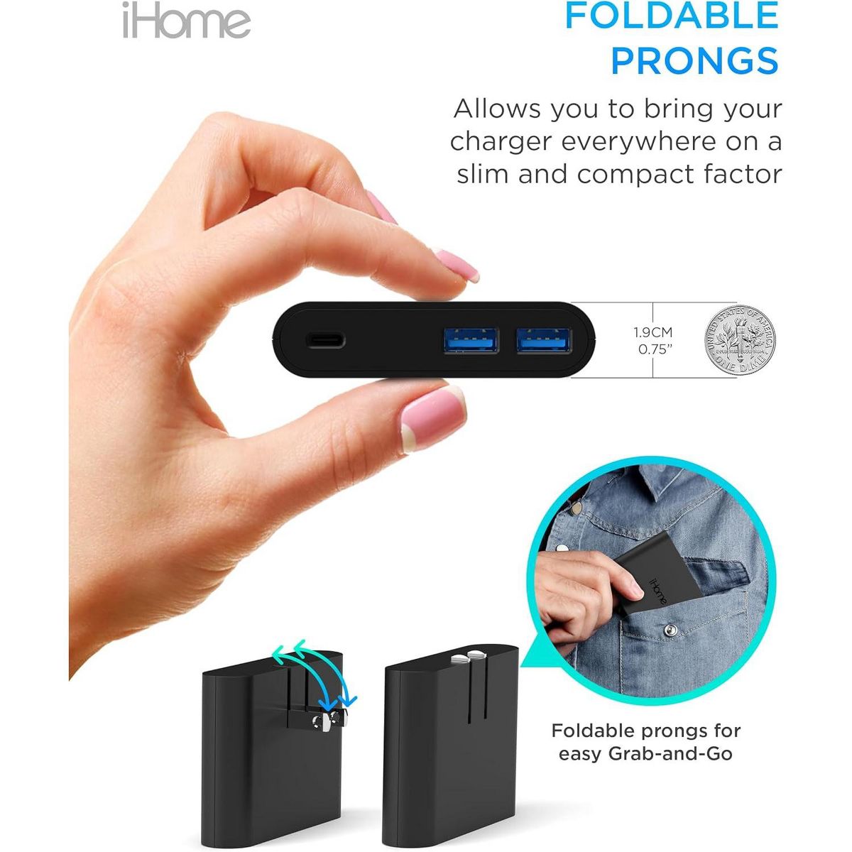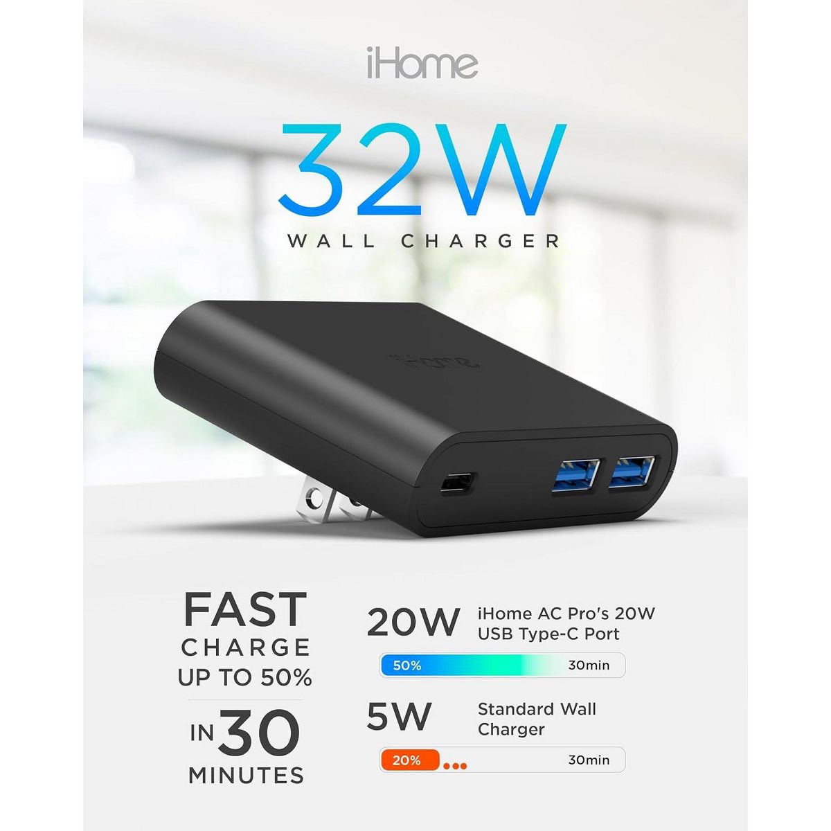 iHome 32W AC Pro Multi Port USB Wall Charger - Charging Station with 3 Ports (1 USB-C, 2 USB-A) Fast Charging, Universal Compatibility