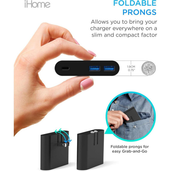 Experience the power of multiple charging with iHome's 32W AC Pro Multi Port USB Wall Charger - your ultimate charging hub. This compact and sleek usb charging hub is equipped with 3 total USB ports - 1 USB C port and 2 USB A ports. Charge your iPhone, iPad, Apple Watch, or any other mobile device simultaneously, without the need for multiple charger blocks. The USB-C port supports power delivery, offering you the luxury of charging 2x faster, with 50% in just 30 minutes, making it a true usb c fast charger. This usb c wall charger has a unique flat and slim design, allowing it to fit snugly behind tight spaces and furniture, making it the perfect sleek socket for your charging needs. With its universal compatibility, it works with all USB charging cables, transforming into a versatile charging station for Apple devices and beyond. The foldable prongs offer ultimate portability, making it an excellent travel companion. It can easily fit in your bag or suitcase, ensuring you always have a charging station at your fingertips. Gone are the days of carrying around multiple chargers for multiple devices. With the iHome 32W AC Pro Multi Port USB Wall Charger, you have a single, powerful charger for all your gadgets. The type c charger offers fast charging, making it an ideal iPhone fast charger or iPad charger. This usb c charger block ensures your devices are always ready and charged. Whether you're at home or on the go, this usb wall charger is your one-stop charging solution. It isn't just a usb charger, or a usb c charger block, or even a usb wall plug. It's all of these and more, rolled into one. It's a charging station, a fast charger, a wall charger, and a charger block, designed with a modern, sleek look that complements any space. Experience the power and convenience of the iHome 32W AC Pro Multi Port USB Wall Charger, the ultimate usb charging hub for all your devices. With iHome, you get more than just a charger, you get a charging solution that fits your lifestyle.