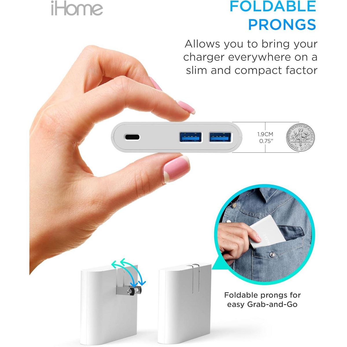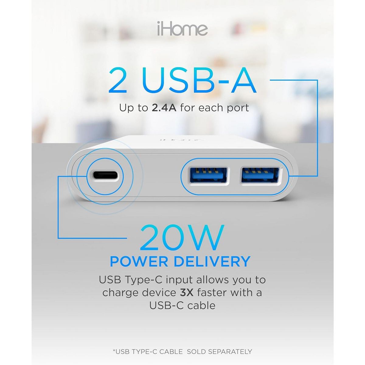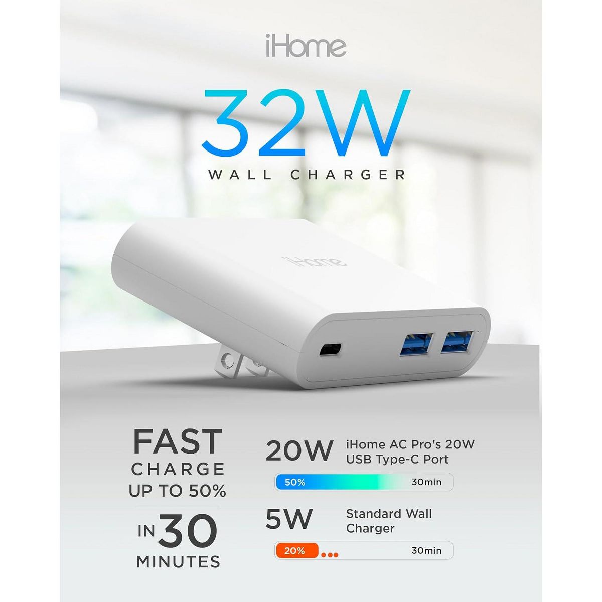 iHome 32W AC Pro Multi Port USB Wall Charger - Charging Station with 3 Ports (1 USB-C, 2 USB-A) Fast Charging, Universal Compatibility