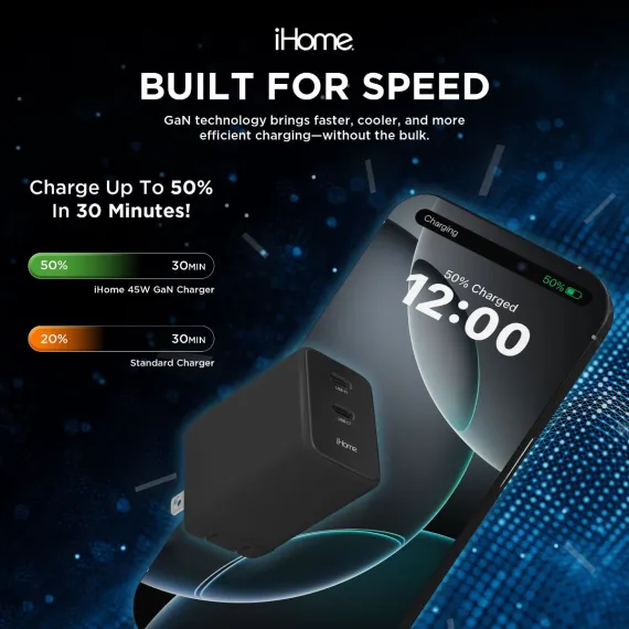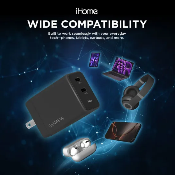 Meet your new everyday power solution: the iHome 45W GaN Universal Charger. Engineered for speed, efficiency, and portability, this compact powerhouse uses cutting-edge GaN (Gallium Nitride) technology to deliver a faster, cooler, and more energy-efficient charge than traditional silicon-based adapters. Whether you're powering your laptop, phone, tablet, or all of the above, this charger keeps up with your modern lifestyle. With 45W of output power and dual USB-C ports, you can easily charge two devices at once—no need to choose between your phone and laptop on the go. Power Delivery (PD) ensures optimized charging speed for each connected device, while the multi-protection safety system guards against overcharging, overheating, and short-circuiting, so you can plug in with confidence. Designed with travel in mind, the iHome charger features folding prongs for easy storage and a lightweight form factor that fits seamlessly into your tech bag or carry-on. Whether you're at home, in the office, or halfway around the world, this charger is ready to deliver powerful performance wherever you plug in. Upgrade to the iHome 45W GaN Universal Charger and experience faster, smarter, and safer charging—designed for life on the move.