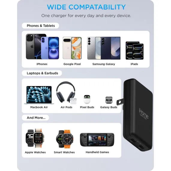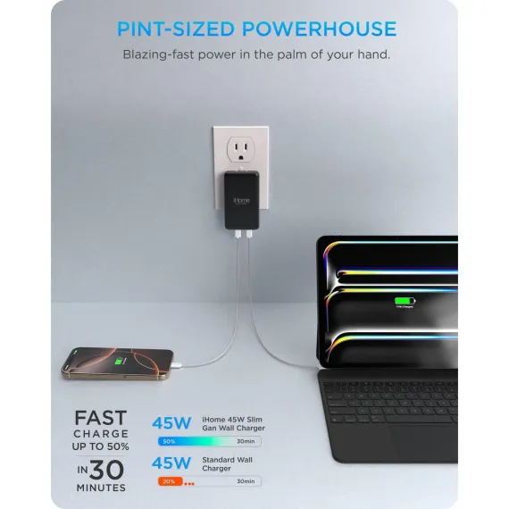 The iHome 45W Ultra Slim Wall Charger with Dual USB-C Ports is a powerful, space-saving solution for fast, reliable charging. Designed with both performance and convenience in mind, this compact charger delivers up to 45W of total output—enough to power your laptop and phone simultaneously from a single wall outlet. Equipped with dual USB-C ports, you can power two devices at once with smart distribution of up to 45W total. Power Delivery (PD) technology ensures fast, efficient charging for compatible phones, tablets, and lightweight laptops—like the MacBook Air—so you can stay powered up wherever you are. The charger’s ultra slim profile makes it a perfect fit for tight spaces—slide it behind furniture or use it in crowded airport outlets without bulky blocks getting in the way. At the heart of this charger is GaN (Gallium Nitride) chip technology, which allows for more efficient power conversion while generating less heat. Compared to traditional silicon-based chargers, GaN enables faster, cooler, and more compact performance—making it a smart, modern choice for your daily tech needs. ETL certified for safety, this iHome charger includes protection against overcurrent, overvoltage, and overheating. It's a fast charger you can trust to safely power your devices day after day. With dual USB-C ports, fast 45W Power Delivery, and advanced GaN technology, this slim, travel-ready charger is built for speed, efficiency, and safety. It’s powerful enough to keep your essential devices running and compact enough to go anywhere. Upgrade your charging setup with a smarter, more streamlined solution.