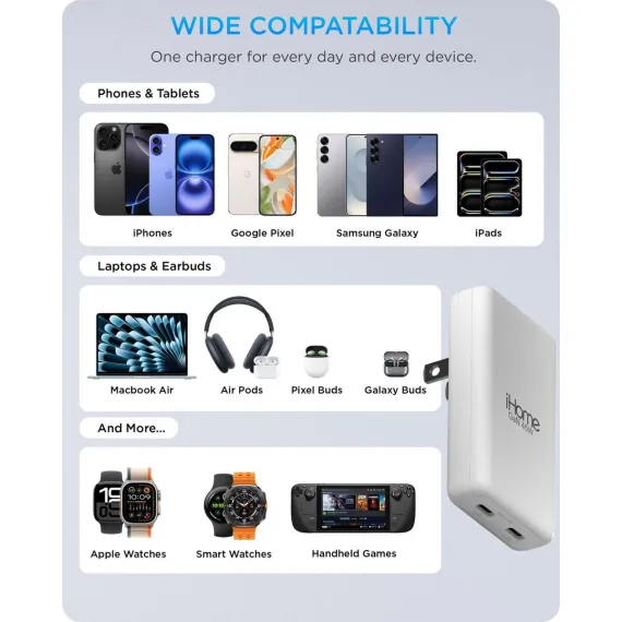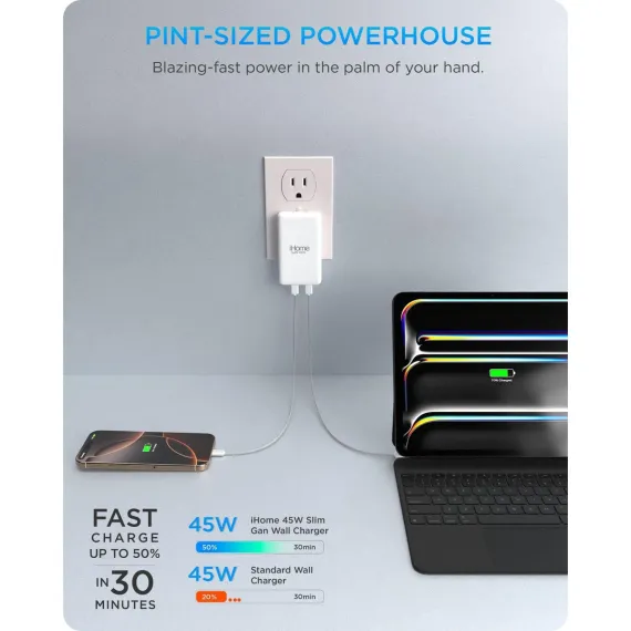 The iHome 45W Ultra Slim Wall Charger with Dual USB-C Ports is a powerful, space-saving solution for fast, reliable charging. Designed with both performance and convenience in mind, this compact charger delivers up to 45W of total output—enough to power your laptop and phone simultaneously from a single wall outlet. Equipped with dual USB-C ports, you can power two devices at once with smart distribution of up to 45W total. Power Delivery (PD) technology ensures fast, efficient charging for compatible phones, tablets, and lightweight laptops—like the MacBook Air—so you can stay powered up wherever you are. The charger’s ultra slim profile makes it a perfect fit for tight spaces—slide it behind furniture or use it in crowded airport outlets without bulky blocks getting in the way. At the heart of this charger is GaN (Gallium Nitride) chip technology, which allows for more efficient power conversion while generating less heat. Compared to traditional silicon-based chargers, GaN enables faster, cooler, and more compact performance—making it a smart, modern choice for your daily tech needs. ETL certified for safety, this iHome charger includes protection against overcurrent, overvoltage, and overheating. It's a fast charger you can trust to safely power your devices day after day. With dual USB-C ports, fast 45W Power Delivery, and advanced GaN technology, this slim, travel-ready charger is built for speed, efficiency, and safety. It’s powerful enough to keep your essential devices running and compact enough to go anywhere. Upgrade your charging setup with a smarter, more streamlined solution.