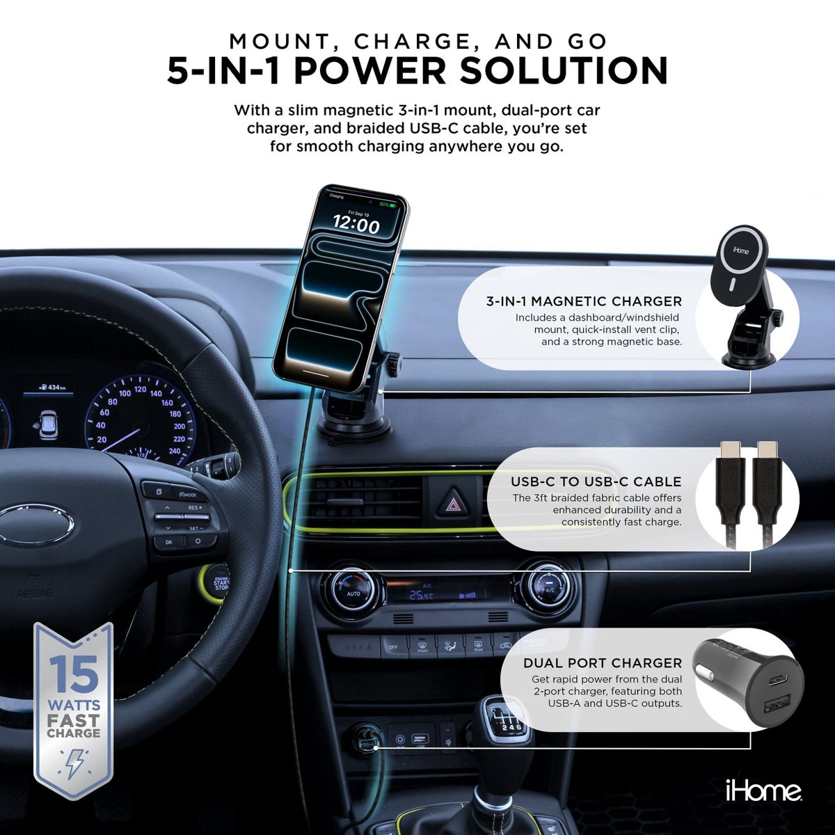 iHome 5-in-1 Complete Car Charging Kit, 15W MagSafe Charger, Dual Port Adapter, Mounts & Cable