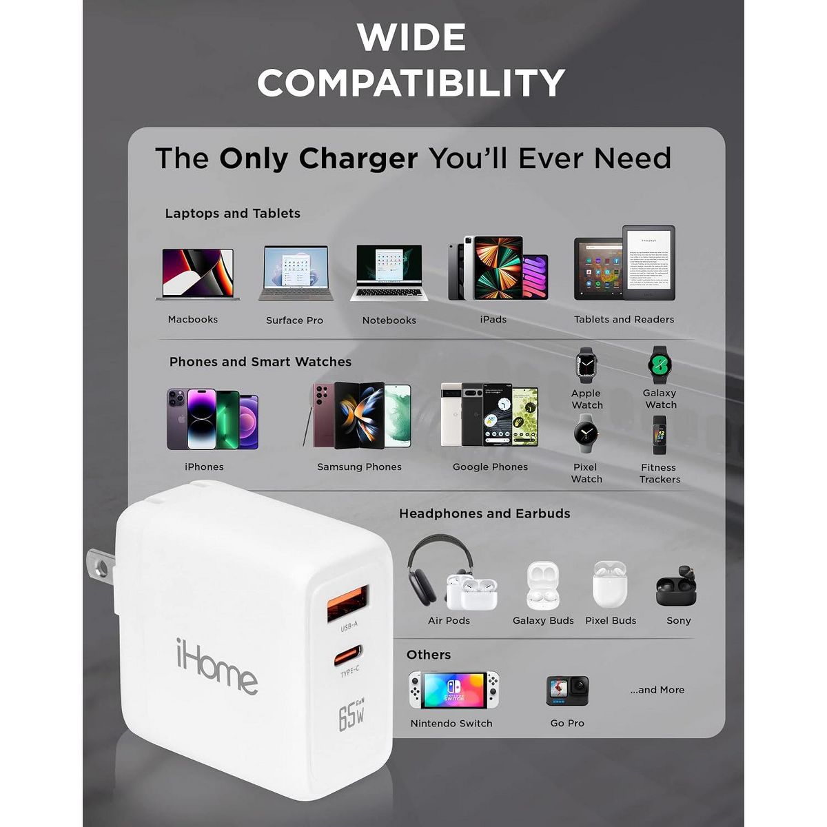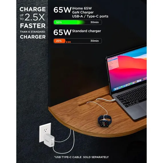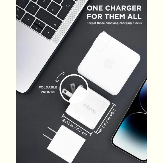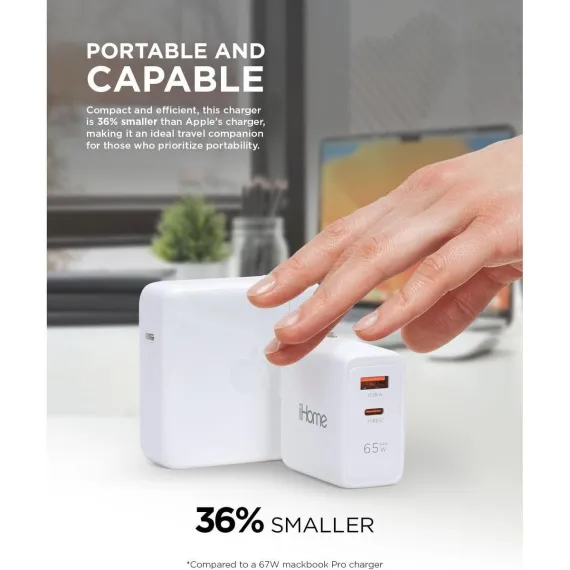 Experience the power of gallium nitride (GaN) technology with the iHome 65W GaN Charger, a revolutionary USB-C block that charges faster and operates more efficiently than traditional chargers. This USB charging block utilizes GaN technology to produce less heat, enabling quicker charging and a more compact design, making it an essential accessory for tech enthusiasts. Imagine the convenience of a USB charger that allows you to charge two devices at once, like the iHome 65W GaN Charger with dual charging ports. This USB-C charger block is equipped with 1 USB-C port and 1 USB-A port, making it ideal for multitasking and minimizing the mess of multiple chargers. Harness the power of a wall charger with a 65W output, like the iHome 65W GaN Charger, capable of powering a laptop while also charging other mobile devices. With USB-C compatibility, this charger ensures your devices are charged quickly and efficiently, making it a crucial tool for those who heavily depend on their electronic devices. Enjoy the convenience of c chargers fast charging with the ultra-compact iHome 65W GaN Wall Charger, featuring a foldable plug design for easy portability. This charger fits into the category of cell phone chargers & power adapters, making it perfect for travel or for use at home, work, or school. Rest easy knowing your devices' safety is prioritized with the iHome 65W GaN Wall Charger, a reliable 'phone charger' designed with safety features such as over-voltage protection, over-current protection, and short-circuit protection. This charger, one of the best chargers for multiple devices, ensures your devices are charged safely and efficiently, making it a trustworthy choice for those who prioritize the safety of their devices.