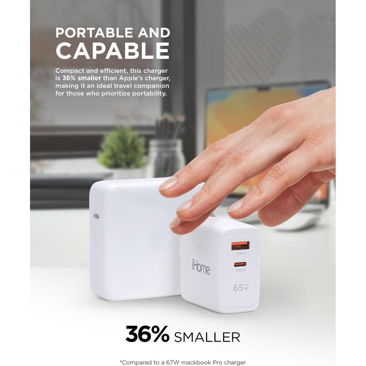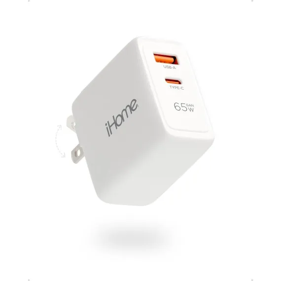 iHome 65W GaN Charger Block, Dual Port (USB-C PD & USB-A), Fast Charging Laptop Adapter with Foldable Plug, White