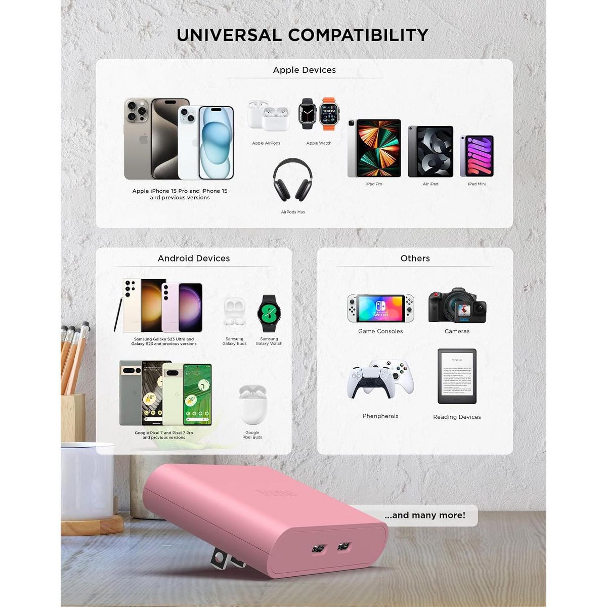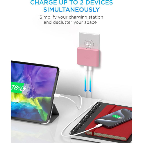 Our 2 port wall charger USB-C doesn't just allow you to charge one device quickly, but two devices simultaneously, making it a highly efficient USB wall charger. Whether you need to power up your iPhone and iPad at the same time or have multiple devices that need charging, this USB wall plug streamlines your charging process.