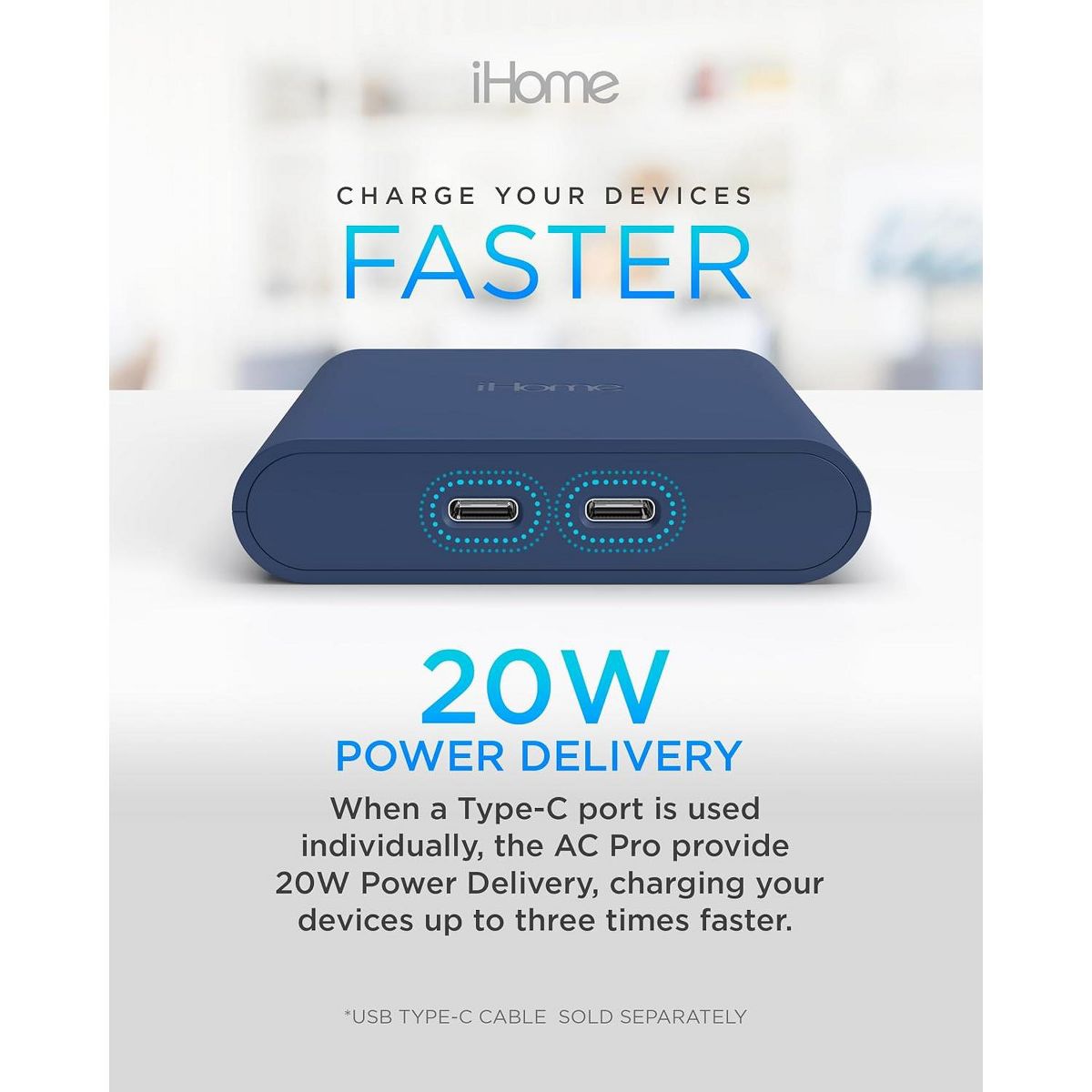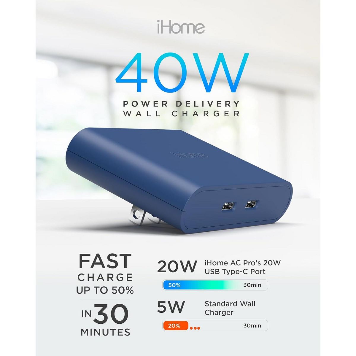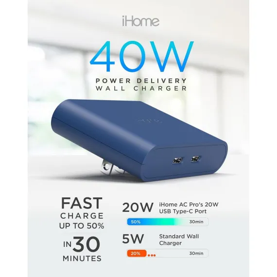 The iHome USB-C wall plug stands out with its power delivery feature, charging your mobile device up to 2.5 times faster than a standard 5W Apple wall charger. This USB-C charger block is a game-changer, allowing you to achieve up to 50% charge in just 30 minutes, making it an indispensable wall charger in today's fast-paced world.