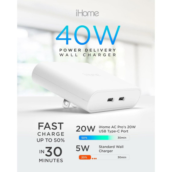 Charging blocks are a thing of the past with the iHome Multiport 40W USB-C Charger, which turns a single AC outlet into a multi-USB charging hub. Experience the power of a fast charging block, enabling you to power two devices at once, eliminating the need to wait for one device to charge before plugging in another. The iHome USB-C wall plug stands out with its power delivery feature, charging your mobile device up to 2.5 times faster than a standard 5W Apple wall charger. This USB-C charger block is a game-changer, allowing you to achieve up to 50% charge in just 30 minutes, making it an indispensable wall charger in today's fast-paced world. Our 2 port wall charger USB-C doesn't just allow you to charge one device quickly, but two devices simultaneously, making it a highly efficient USB wall charger. Whether you need to power up your iPhone and iPad at the same time or have multiple devices that need charging, this USB wall plug streamlines your charging process. Unlike the typical bulky iPhone charger plugs, the iHome USB-C charger block features a flat, slim design, making it a practical 20w USB-C power adapter. Easily access hard-to-reach outlets and add a stylish touch to your home or office with these sleek chargers. The iHome AC Pro stands out among chargers for multiple devices with its foldable prongs, making it easy to pack into your bag or suitcase. Whether you're commuting to work or on a holiday, these phone chargers ensure your devices are always charged, no matter where you are.