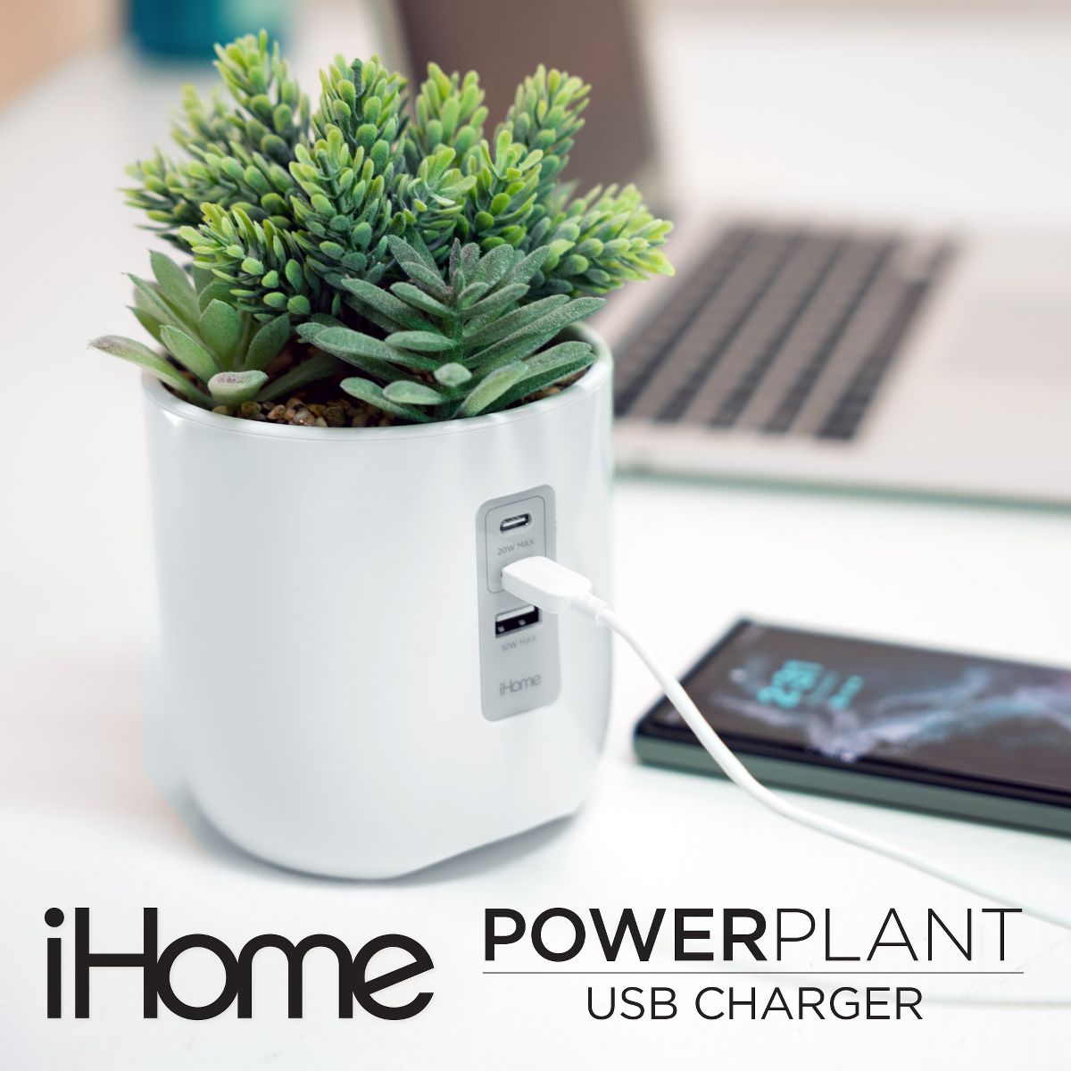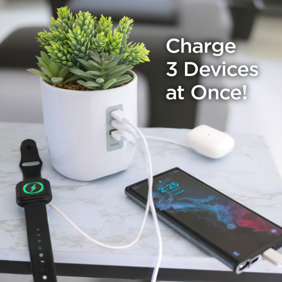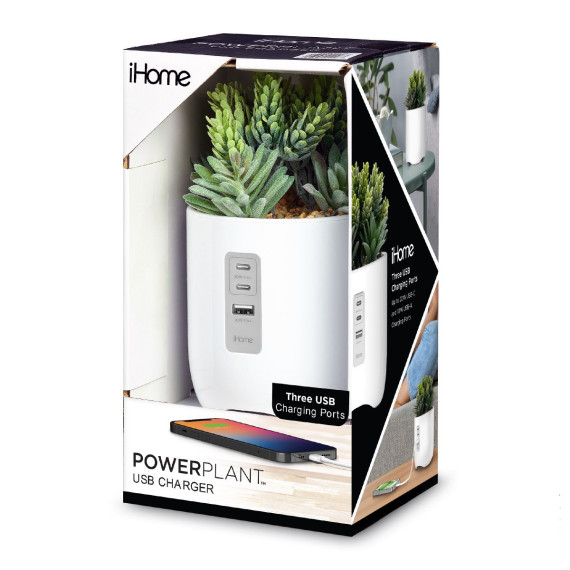 The iHome PowerPlant USB Charging Station will make a unique and stylish addition to any home or office decor. The sleek high gloss pot features a realistic faux succulent design that enhances any space, all without the upkeep of maintaining a real plant. Use this decorative phone charger to charge multiple devices (including iPhone, Android, and Samsung phones) at the same time using two USB-C ports (20W max shared) and one 10W USB-A charging port (cables not included).