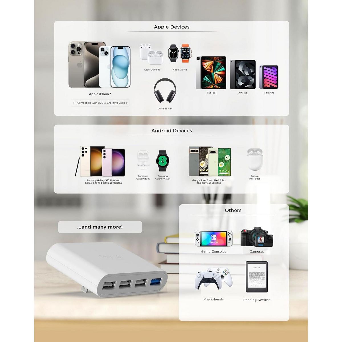 iHome Slim 4-Port USB Wall Charger, AC Pro Multiport Plug Adapter, Phone Charging Block with 4 Ports, Flat USB Wall Adapter for Home & Travel