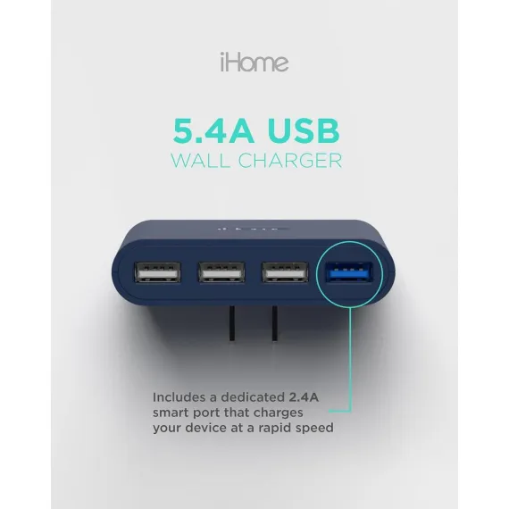 4 PORT USB POWER ADAPTER: iHome's phone wall charger block is a usb adapter plug that converts a single AC outlet into a multiple usb charger, allowing you to charge up to 4 devices at the same time! FLAT USB WALL PLUG: Our USB charger block is flat and not bulky like other USB blocks. iHome's flat usb wall charger and USB plug offers a slim design that allows you to easily access hard to reach outlets that are behind furniture or other tight spaces. RAPID CHARGING BLOCK: iHome's USB wall charger multiport includes a dedicated 2.4A port to rapidly charge your phone or tablet twice as fast as other standard charging blocks FOLDABLE PRONGS: You won't find another iPhone block wall charger that fits as easily into your bag or suitcase as the iHome AC Pro 4 USB wall charger. WALL CHARGER WITH USB PORTS: The AC Pro is one of the most unique cell phone wall chargers on the market- our rapid fast charging block allows you to charge your iPhone, Android, iPad, AirPods, and more all at once with any of the 4 USB charging ports.