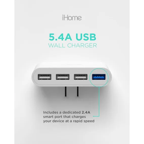 4 PORT USB POWER ADAPTER: iHome's phone wall charger block is a usb adapter plug that converts a single AC outlet into a multiple usb charger, allowing you to charge up to 4 devices at the same time! FLAT USB WALL PLUG: Our USB charger block is flat and not bulky like other USB blocks. iHome's flat usb wall charger and USB plug offers a slim design that allows you to easily access hard to reach outlets that are behind furniture or other tight spaces. RAPID CHARGING BLOCK: iHome's USB wall charger multiport includes a dedicated 2.4A port to rapidly charge your phone or tablet twice as fast as other standard charging blocks FOLDABLE PRONGS: You won't find another iPhone block wall charger that fits as easily into your bag or suitcase as the iHome AC Pro 4 USB wall charger. WALL CHARGER WITH USB PORTS: The AC Pro is one of the most unique cell phone wall chargers on the market- our rapid fast charging block allows you to charge your iPhone, Android, iPad, AirPods, and more all at once with any of the 4 USB charging ports.