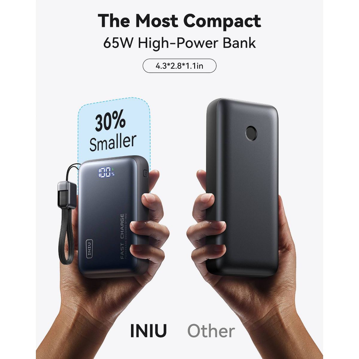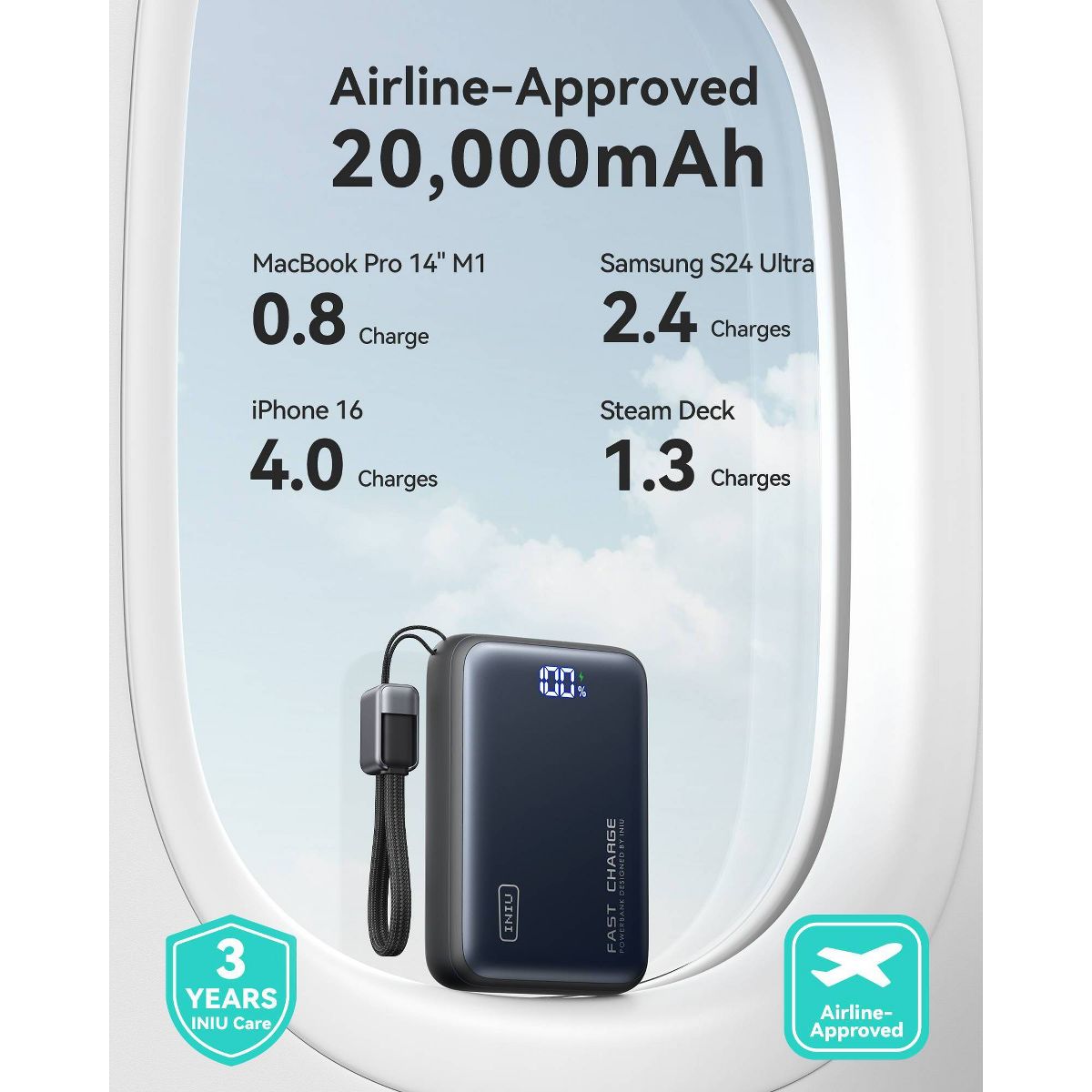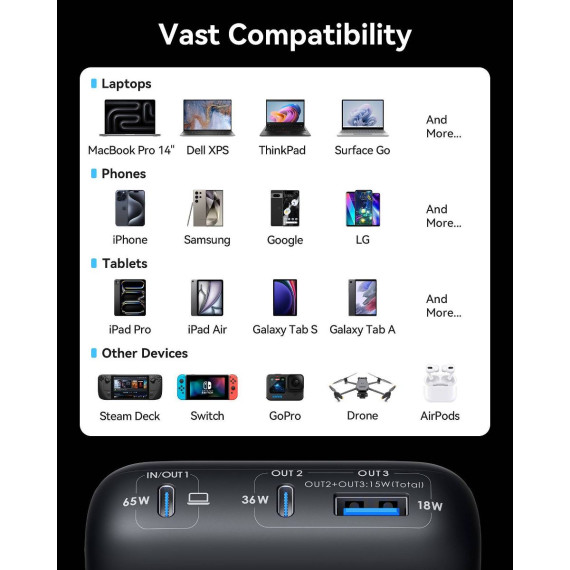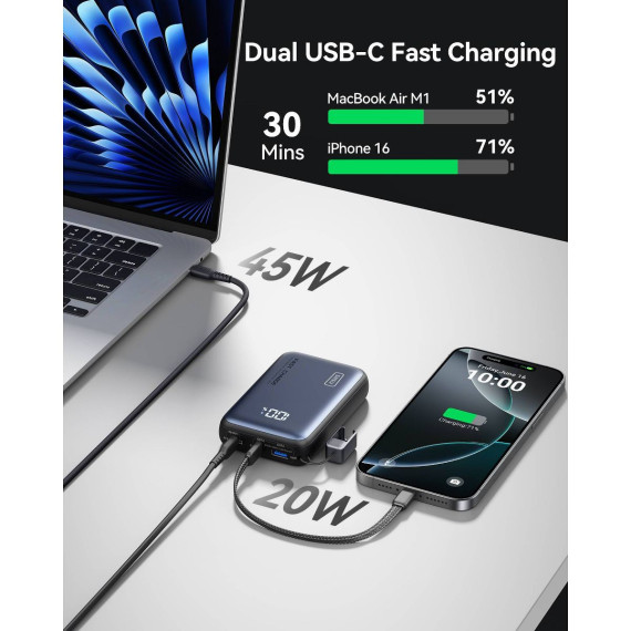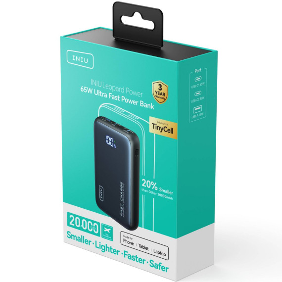 INIU Leopard Power 65W—your ultimate travel companion! This compact 20,000mAh power bank, featuring INIU's TinyCell and HyperStack technology, redefines high-capacity charging. Say goodbye to bulky chargers and enjoy portable power! Fuel your MacBook Pro 14" at lightning speed with 65W charging, getting you back to work or play in no time. It’s perfect for all devices—from gaming consoles to smartwatches—ensuring you’re always ready. What's more, you are also back up with industry-leading 3-year warranty!