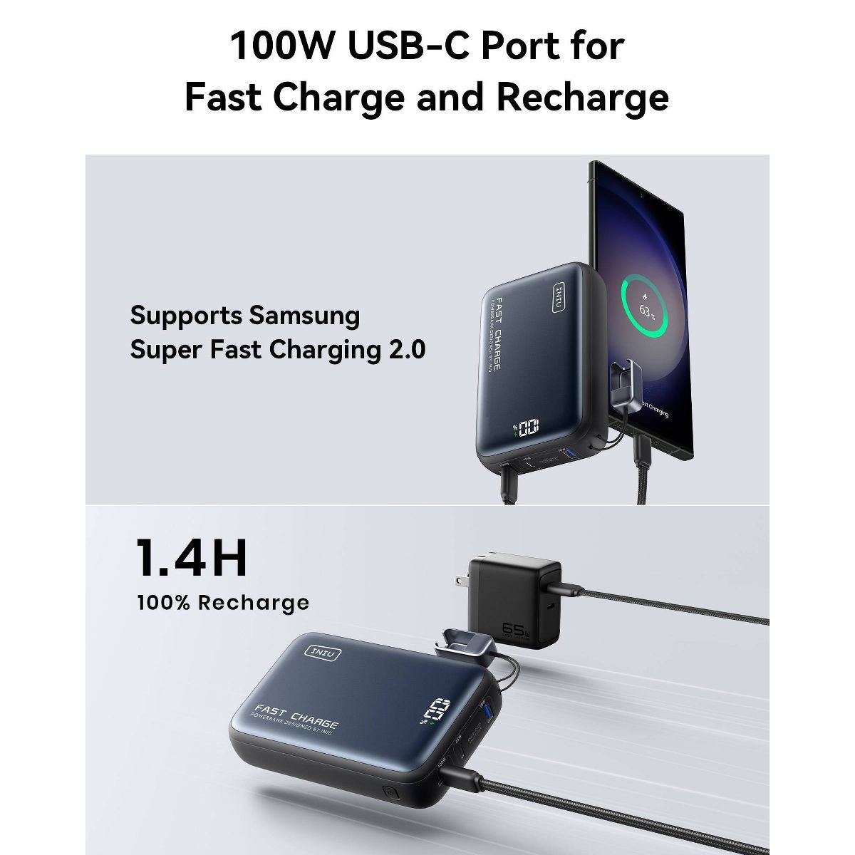 INIU Leopard Power 25000 mAh PD 100W Fast Charging Power Bank with attached USB-C Cable - Black: Rechargeable, USB/USB-C Connections