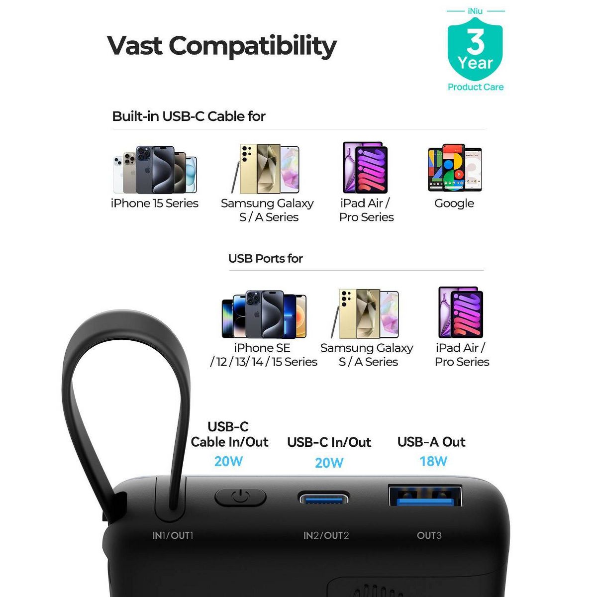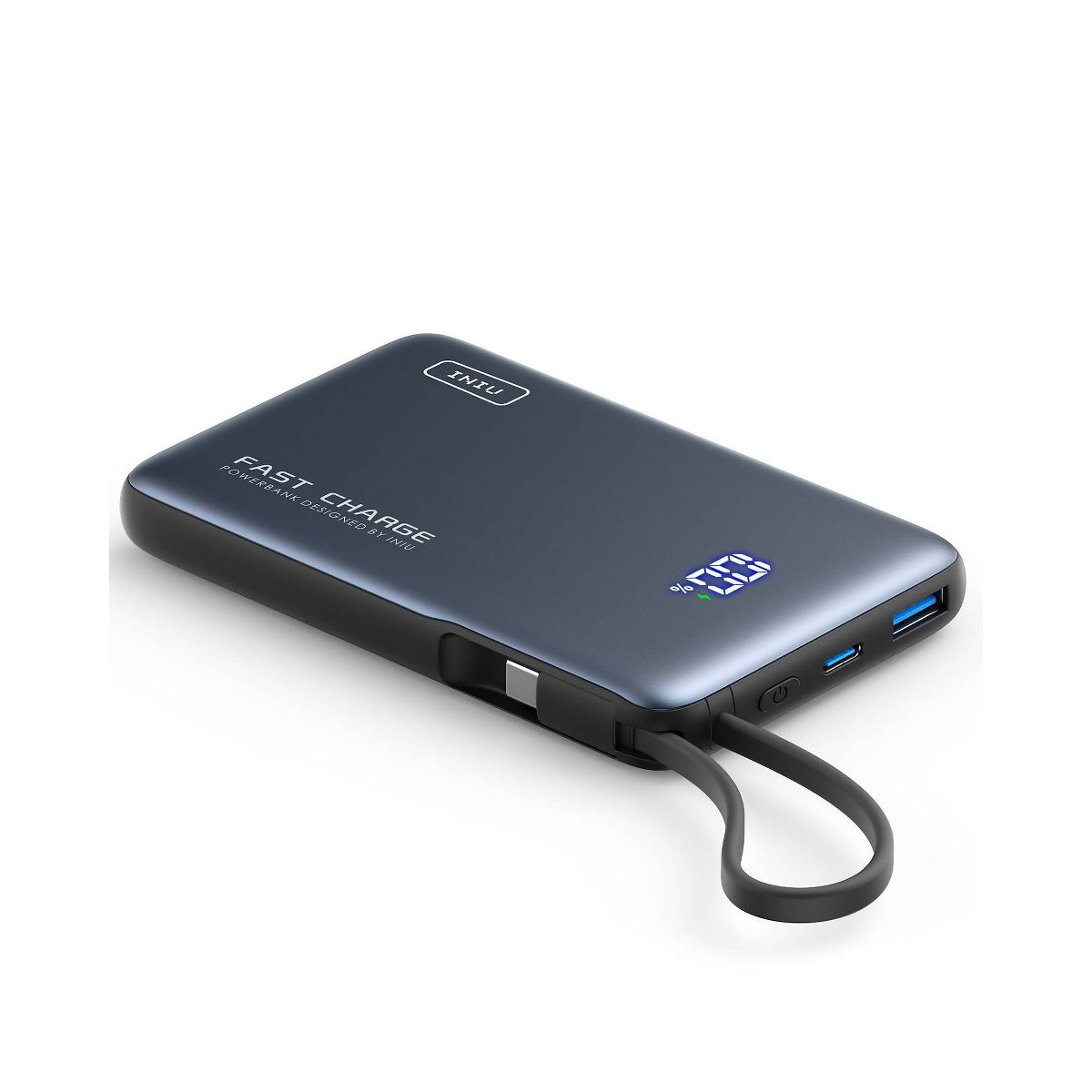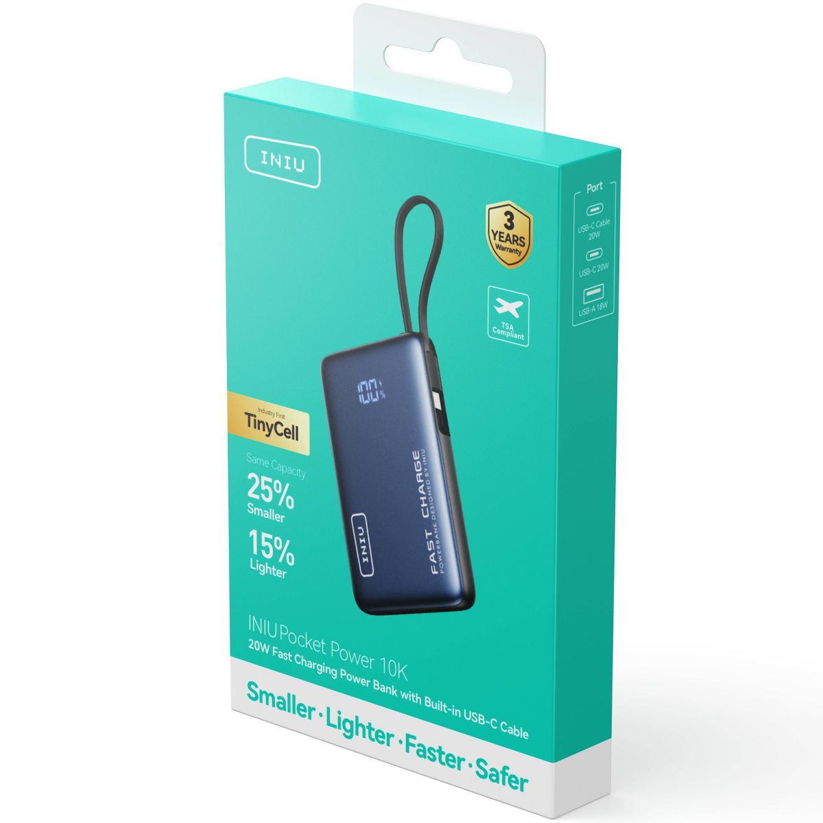 INIU Pocket Power 10000 mAh PD 20W Fast Charging Power Bank with Built-in USB-C Cable - Black: USB, Rechargeable, 12V Output