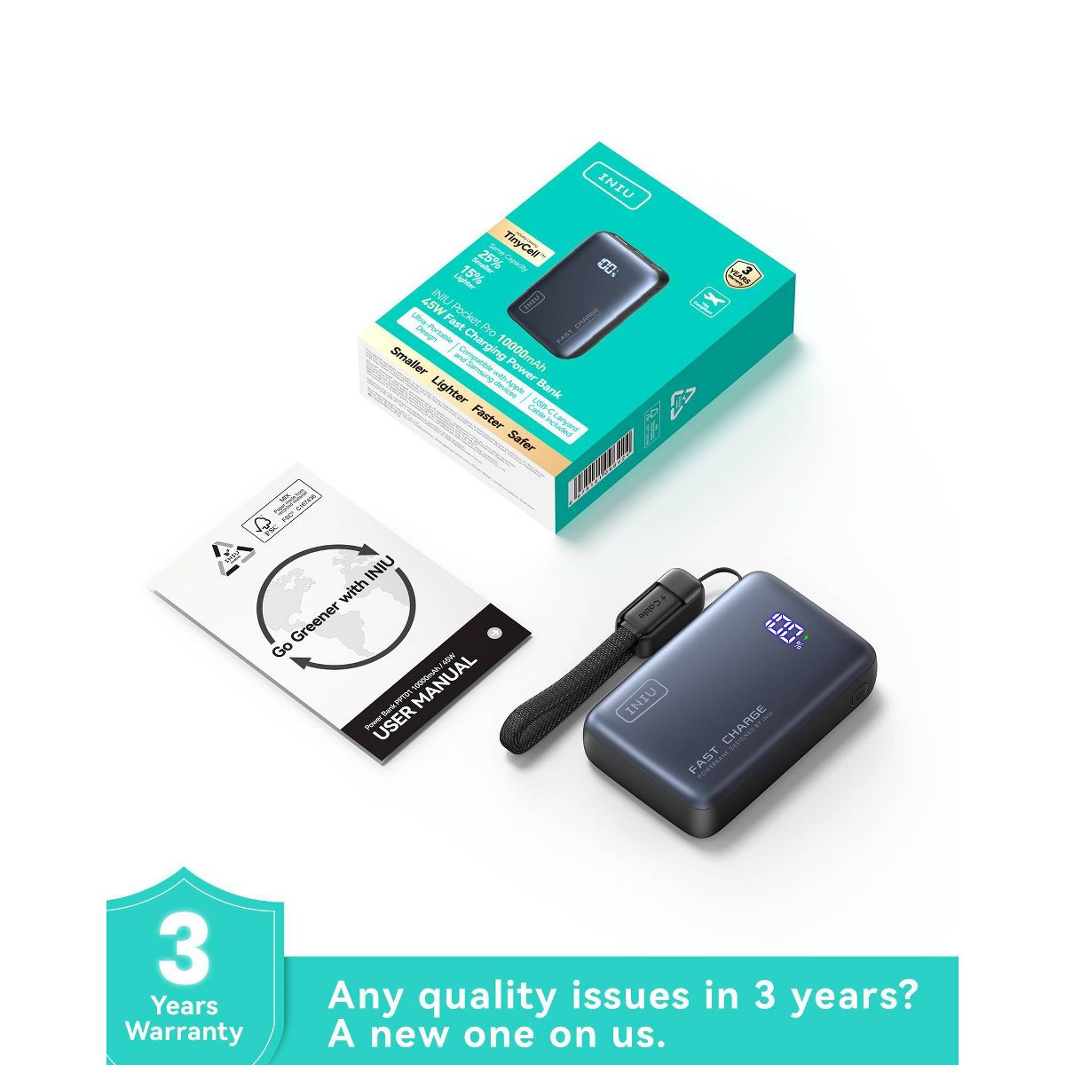 INIU Pocket Pro 10K is a game-changer in portable charging, offering a palm-sized, ultra-lightweight design that fits easily into any pocket—no bag required. With a handy USB-C cable for seamless charging and no need for extra cords, you’re always ready to go. What's more, you are also back up with industry-leading 3-year warranty!