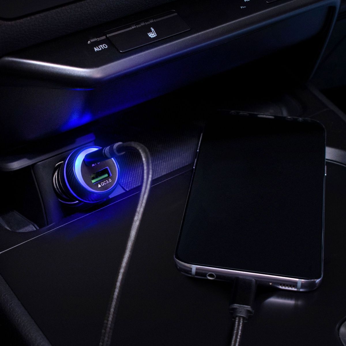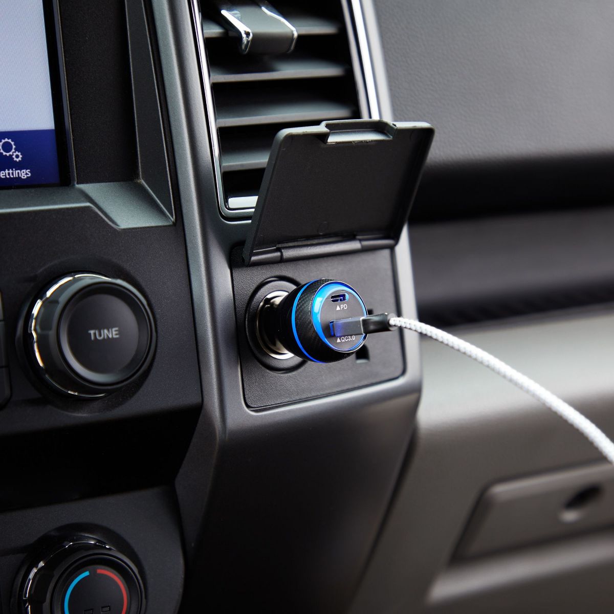 Rapidly charge up to 2 mobile devices at the same time in your car using this 2-port USB C car charger adapter, compatible with USB Type-A fast charging and USB Type-C Power Delivery 3.0 (PD). When used individually, the PD port can provide 27W PD (5V/3A, 9V/3A, or 12V/2.25A) and the Type-A port can provide 18W charging power (4-5V/3.6A, 9V/2A, or 12V/1.5A). When both ports are in use, they are both limited to 18W of PD and charging power (5V/3.6). For non-compatible devices, the Type-A port is limited to 12W (5V/2.4A) of charging power. It includes overcharging and overheating protection circuits, ensuring safe and reliable operation that helps prevent damage to your phone and car. At only 2.4 x 1.1 x 0.8 inches, this fast car charger is small enough to fit into a pocket or purse, as well as easy storage in your car's glove compartment or center console compartment. A blue LED illuminates each port and the ring around the ports to help with plugging in cables in a darkened car.