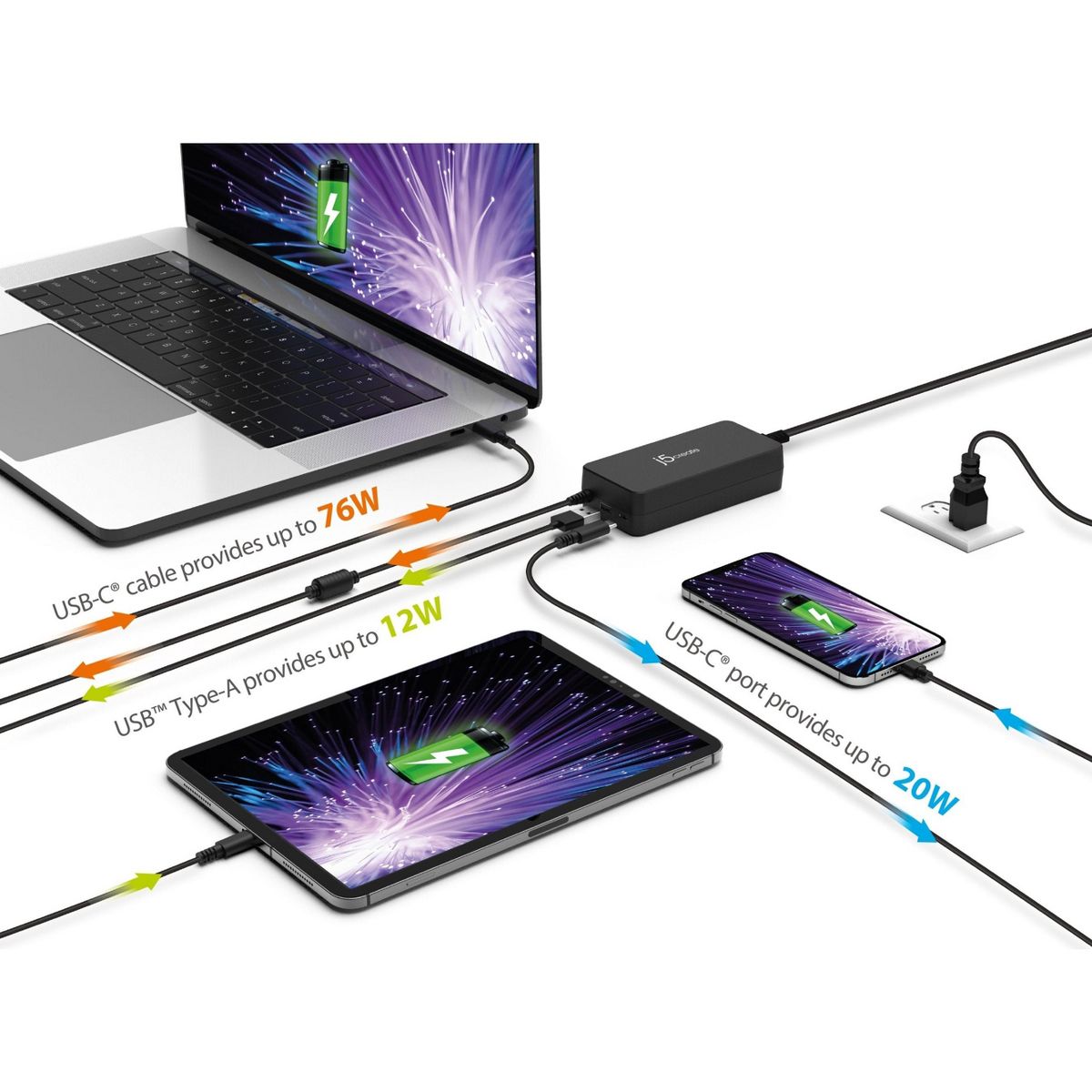 Charge your USB-C laptop and two additional devices simultaneously with the JUP34108 108W 3-Port PD USB-C Super Charger. USB Power Delivery 3.0 technology charges your phones, tablets, and laptops at the fastest speeds possible. This charger provides up to 5V/3A, 9V/3A, 12V/3A, 15V/3A, and 20V/5A of power via the USB-C cable ─ perfect for the 13-inch and 16-inch MacBook Pro and other high-powered laptops. The USB-C port provides up to 5V/3A, 9V/2.22A and 12V/1.67A of power ─ great for fast charging the new iPhone 12 to 50% in just 30 minutes. The USB Type-A port is equipped with fast charging up to 2.4A. The 108W 3-Port PD USB-C Super Charger also comes with surge, overcharging, overcurrent, and overheating protection, keeping your devices safe.