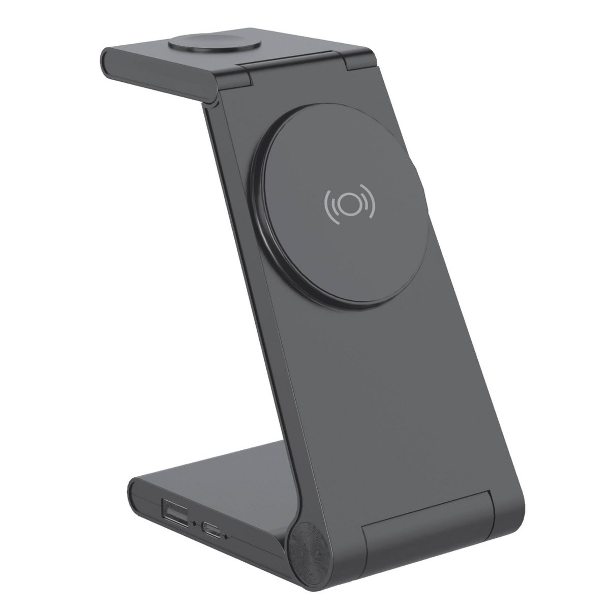 Experience the ultimate in convenience with the Just Wireless 3-in-1 Magnetic Charging Station and Stand. Charge your iPhone®, Apple Watch®, and AirPods® simultaneously for an unmatched seamless experience. Designed for the latest iPhone 16, 15, 14, 13, and 12, including Pro, Pro Max & Plus models, this station ensures a flawless MagSafe® compatible charging experience. Enjoy 15W fast charging for your iPhone and up to 20W total for all devices, ensuring they are powered up quickly and efficiently plus an extra USB port to charge a fourth device of your choice.