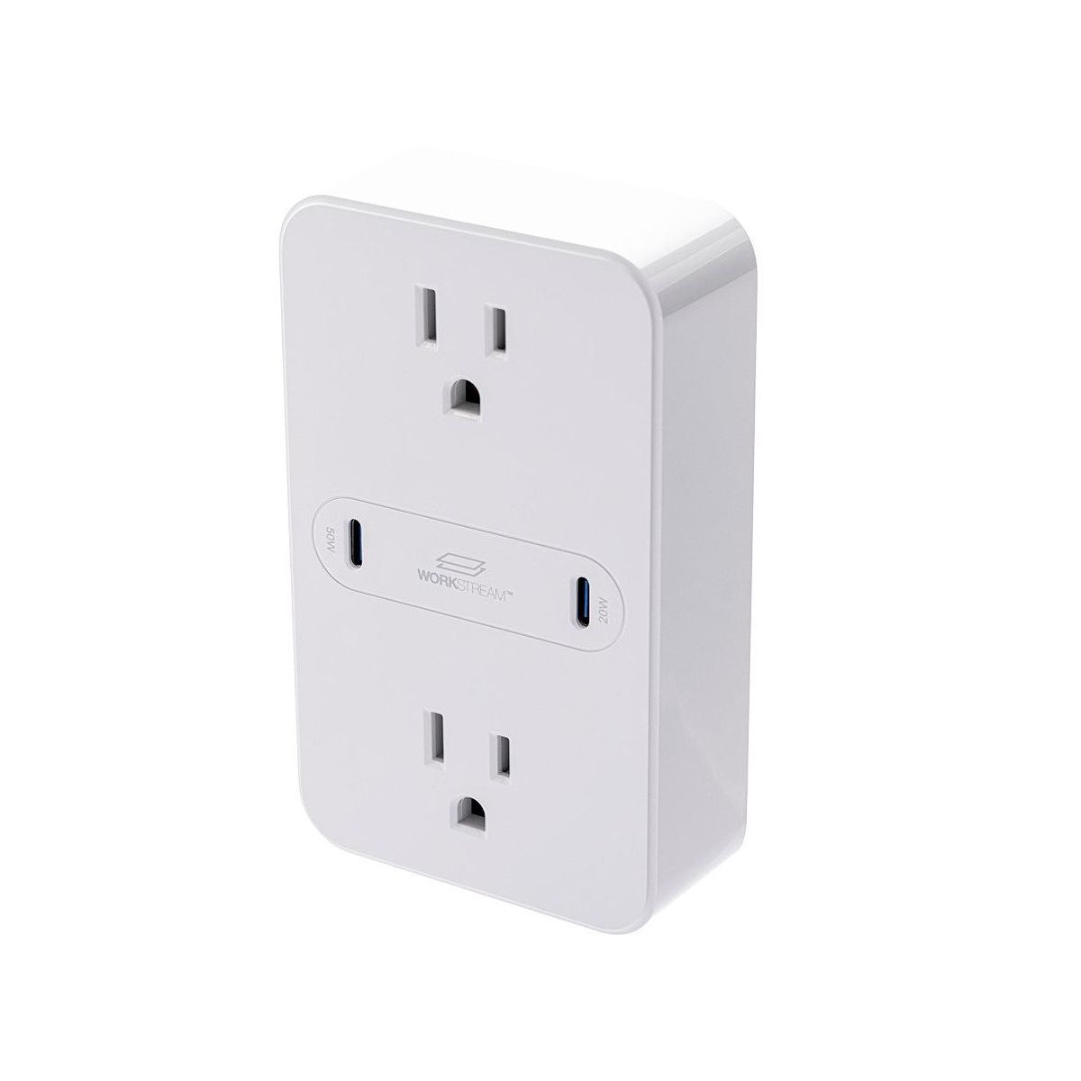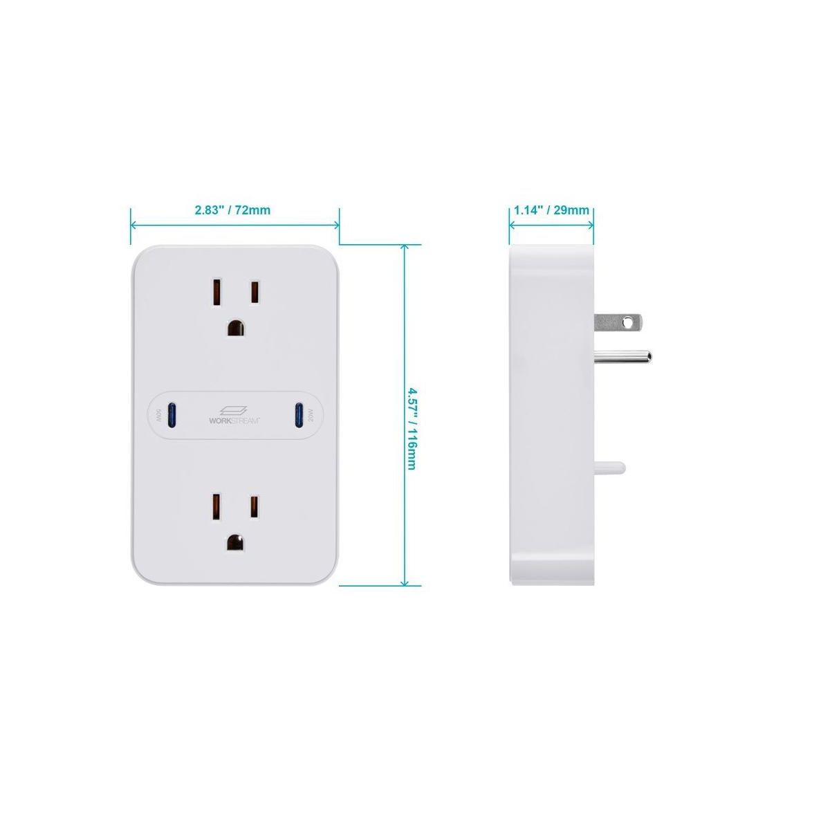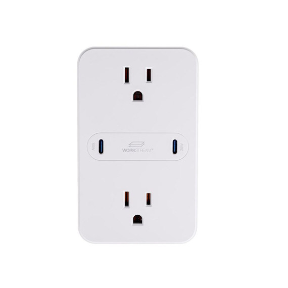 Add fast mobile and laptop charging capabilities to your standard wall outlet using this Workstream 2 Outlet Wall Tap Power Strip from Monoprice! This power strip plugs into a standard wall outlet and features two AC outlets and two USB C charging ports. It has built in over current, over voltage, overload, short circuit, and over temperature circuits, ensuring that your connected devices are fully protected from dirty power. The two NEMA 5 15 power outlets are rated for 125 VAC, 15A/1875W, while the two USB C charging ports are rated for a total of 70W of Power Delivery (PD) 3.0, with 50W for the first port and 20W for the second port. The charging circuits feature Gallium Nitride (GaN) technology, which charges up to three times faster than chargers using traditional Silicon based circuits. The 50W on the first port is more than enough to charge and power laptop and notebook computers. The low profile design saves space and mounts directly over an existing 2 socket AC wall outlet for a clean power distribution solution. It is also compact enough to be portable for travel in your laptop bag.