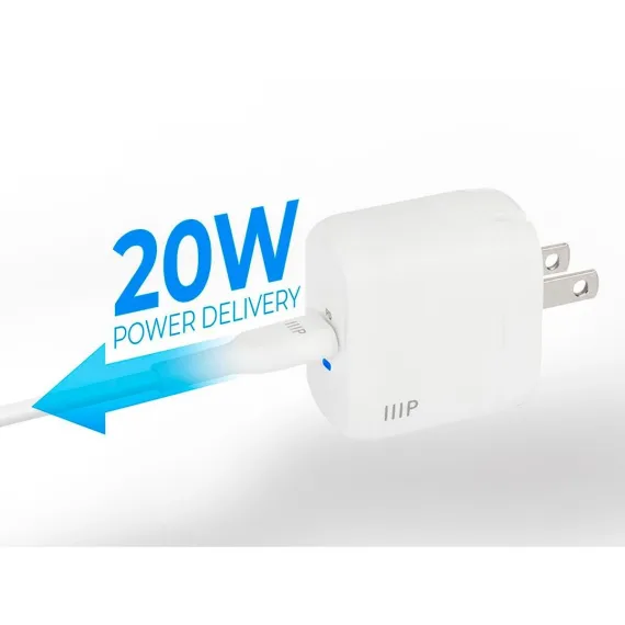 Get all you need to charge and sync your i-Phone* faster and safer than ever in one complete package! Rid yourself of outdated chargers along with their bulky sizes and slow charging speeds. Upgrade to an ultra compact, efficient, safe, and powerful USB Type-C charger with Gallium Nitride (GaN) technology from Monoprice! Gallium Nitride is a superior material for semiconductors than traditional silicon, with higher voltage levels, need for fewer supporting components, and more efficient current transfer. This means there is less power loss to heat, a smaller form factor, and significantly faster charging than silicon-based chargers. Featuring 20W of Power Delivery (PD), this charger provides the fastest and most efficient charging for Lightning port equipped Apple iPhone and iPad, products requiring up to 20W power delivery. *iPhone 12/11/Pro/Max/XR/XS/X and earlier, plus Lightning equipped iPad models.