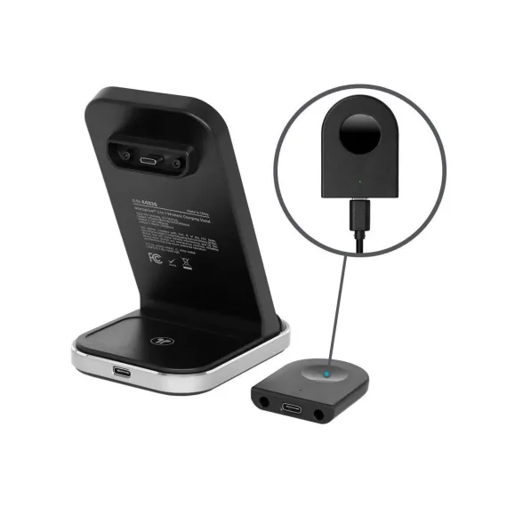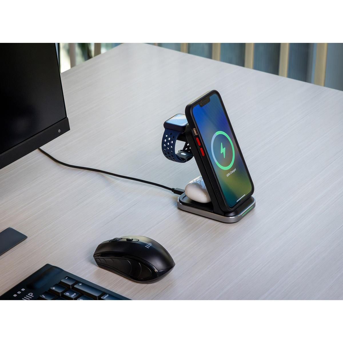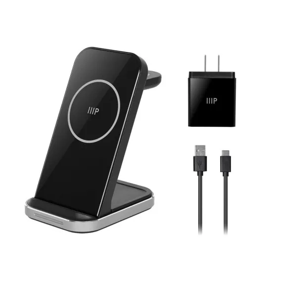 Charge your Apple devices faster with the powerful and compact Monoprice 3-in-1 Wireless Station. Stay organized with dedicated spots to power up your Apple phones, watches, and wireless earbuds simultaneously in one centralized charging station. Quickly charge your connected devices with high-power charging up to 15W. Charge your phone and adjust it either vertically or horizontally, depending on the task at hand: answering a call on FaceTime, listening to music, watching a movie, or using your iPhone in the new Nightstand Mode. The Apple Watch charger is detachable and can be used independently, allowing more flexibility and charging options. The triple-sense LED indicator shows you each device being charged for peace of mind. The compact footprint is less than 4" deep—freeing up space on your nightstand, side table, or desk. This charging station doesn’t need any complicated setup as it comes ready to use right out of the box with its AC power adapter and USB-C cable. Compatible with all the latest Apple iPhone, Apple Watch, and AirPods/AirPods Pro models that support wireless charging.