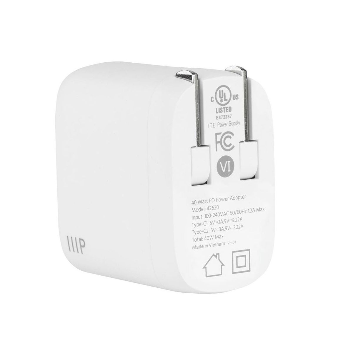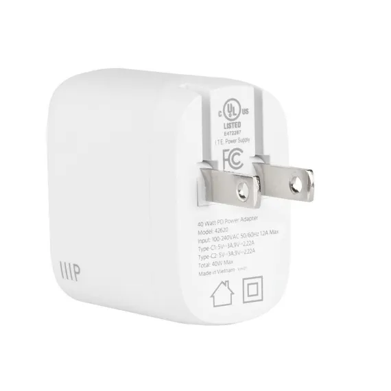 Monoprice 40W 2-port USB-C GaN Charger, Fast Charge, Foldable, Power Delivery for iPad, iPhone, Samsung Galaxy, White
