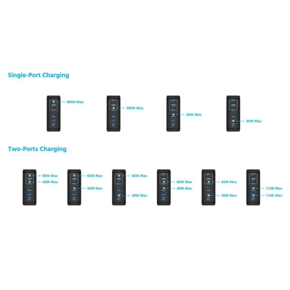 The Monoprice Compact 4-Port 65W GaN Charger is an all-in-one powerhouse that charges multiple devices. With USB Power Delivery technology, two Type-C® ports supply up to 100W single-port output—that’s more than enough to fast charge popular full-sized notebook computers (like the MacBook Pro®, MacBook Air®, Dell XPS™, and ThinkPad® laptops). It is also powerful enough to charge up to two laptops at once—a full-sized one (like a MacBook Pro® laptop) and a lighter-weight one (like a MacBook Air® laptop). Charge up to 4 devices simultaneously, like phones, tablets, and laptops, with Intelligent Power Distribution technology automatically allocating the optimal amount of power to each device, and never worry about overcharging any device. GaN technology increases power efficiency while shrinking the circuit size, providing a compact architecture perfect for fitting into small spaces or taking with you on the go. The folding prong design is there for easy and travel-friendly packing. Our chargers are tested and certified by independent ETL-certified labs to ensure safe performance and protection from overheating, overcharging, excessive current, and short circuits.
