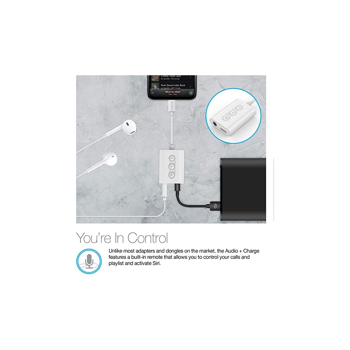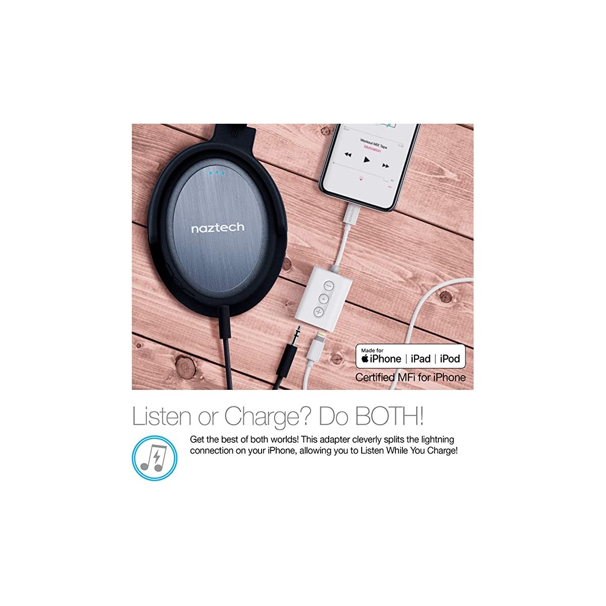 Listen or Charge? How about Listen While You Charge?! This ultra-compact adapter splits the lightning connection, allowing you to enjoy music or talk hands-free while charging your iPhone! It features a Lightning connector on one end and a 3.5mm AUX-in port and Lightning input port on the other. Simultaneously connect your audio device and charger to your iPhone. Get the best of both worlds, Audio + Charge.
