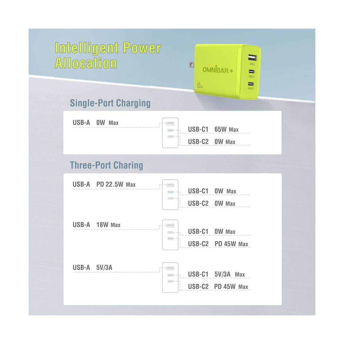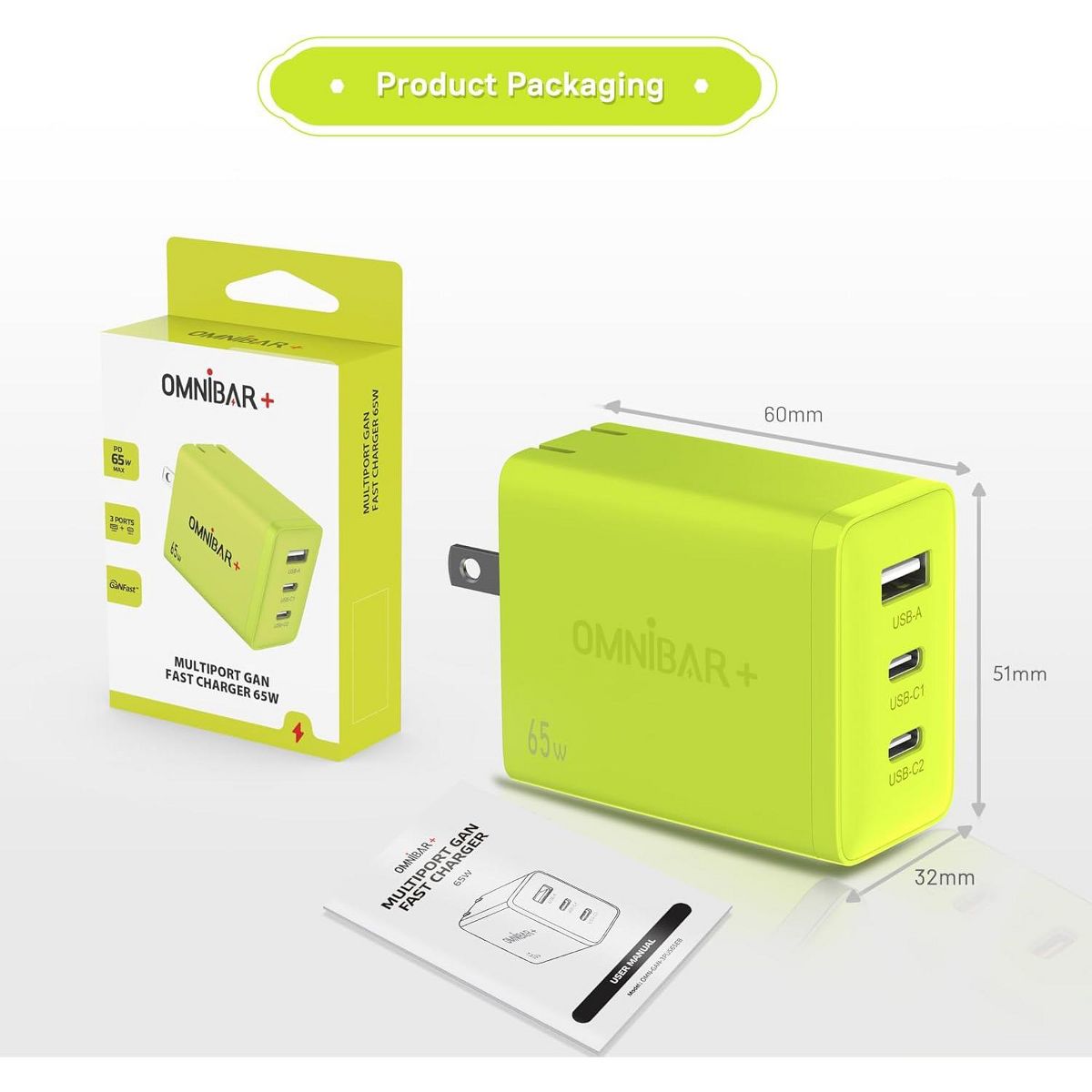 The Omnibar 65W USB C Charger is a compact and powerful charging block featuring advanced GaN III technology for efficient energy transfer and reduced heat. With three versatile ports, it supports fast charging protocols including PPS and PD 3.0, allowing simultaneous charging of multiple devices. Ideal for smartphones, tablets, and laptops, this USB C wall charger ensures rapid and reliable performance.