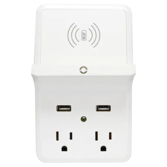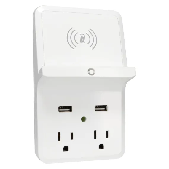 Prime Wire and Cable Wireless-Charging-Dock Wall Tap with 2 Outlets and Dual USB Charger in White