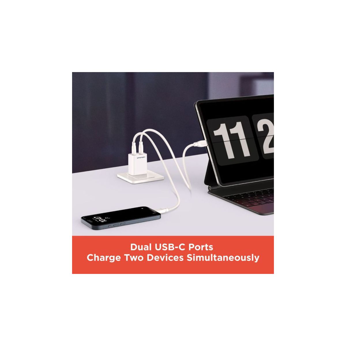 One port charging is so last year. Upgrade your charging capabilities to something a little more in line with the times. That’s why you need an ultra-powerful 2-port USB charger. The dual USB-C ports offer versatile compatibility, allowing you to charge a wide range of devices, including smartphones, tablets, laptops, and more, without losing a beat. Whether you need to charge one device or multiple devices simultaneously, this charger has you covered. Think of how useful that would be in a crowded airport where outlets are hard to find. The two USB-C Power Delivery (PD) ports each deliver 20W of power, so this charger is designed to meet or exceed all your charging needs and delivers a 50% charge in about 30 minutes. The compact and portable design makes it ideal for travel, work, or home use. The sleek white finish adds a touch of style to your charging setup while allowing you to easily color mark it, so you know it is yours. Its durable manufacturing guarantees long-lasting performance as it is made from high-quality materials, including sturdy ABS plastic, so it can live up to any regular prolonged use you might put it through. This 2-port USB PD charger is a game changer, and you will understand its value once you start using it. And remember, two is always twice as good when it comes to delivering reliable power.