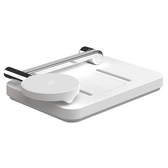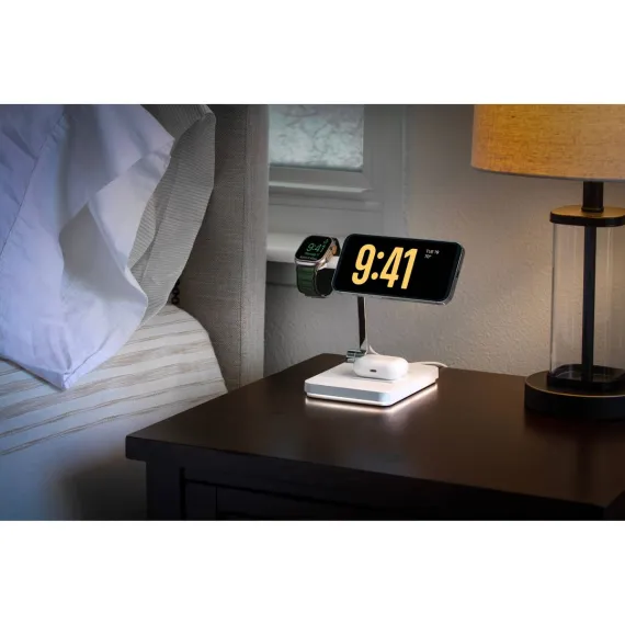Elevate your charging experience with The Scosche 3-in-1 Wireless Charging Station. Designed with MagSafe technology, it secures a swift connection for iPhone 15/14/13/12 and AirPods Pro Series. Organize and charge multiple devices simultaneously with the Apple Watch charger stand (charger sold separately). Enjoy efficient 10W MagSafe charging and transform any phone into a MagSafe device with the included MagicRing Adapter. This sleek station keeps your desk clutter-free and features a high-speed 15W USB-C port, ensuring your devices are always ready to use. With innovative design such as foreign object detection, and over-voltage protection, it's the ultimate charging solution. The chrome arm adjusts for optimal viewing angles, and a touch-controlled LED nightlight adds a touch of sophistication.