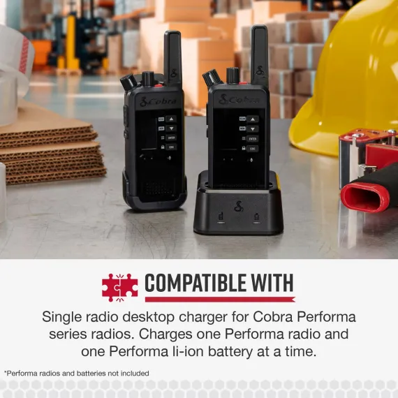 Is your company using Cobra® Performa 400 or 450 LMR 2-way handheld business radios? Charge your radio and an extra battery with this handy single-radio desktop dock from Cobra®. Like the radio itself, this dock is of sturdy construction for heavy use and tough environments. It comes with a USB-C® to USB-A charging cable as well as its own wall adapter.